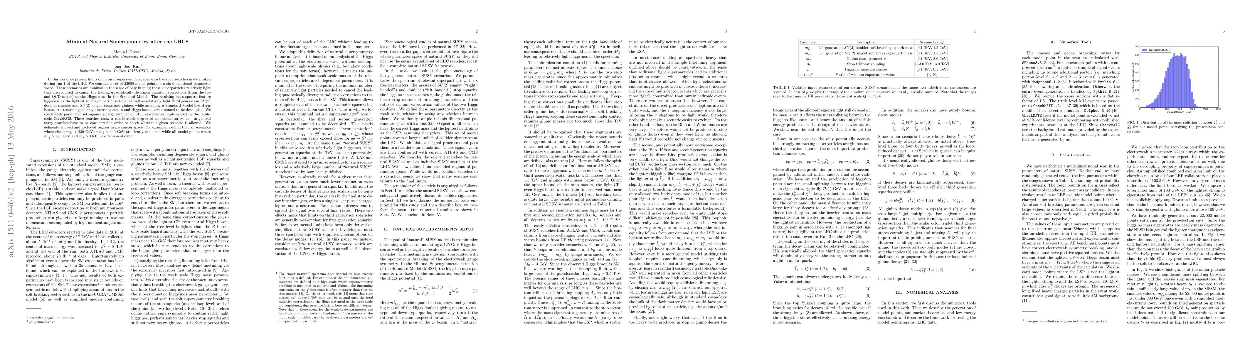 In this work, we present limits on natural supersymmetry scenarios based on searches in data taken during run 1 of the LHC. We consider a set of 22000 model points in a six dimensional parameter space. These scenarios are minimal in the sense of only keeping those superparticles relatively light that are required to cancel the leading quadratically divergent quantum corrections (from the top and QCD sector) to the Higgs mass in the Standard Model. The resulting mass spectra feature higgsinos as the lightest supersymmetric particle, as well as relatively light third generation $SU(2)$ doublet squarks and $SU(2)$ singlet stops and gluinos while assuming a Standard Model like Higgs boson. All remaining supersymmetric particles and Higgs bosons are assumed to be decoupled. We check each parameter set against a large number of LHC searches as implemented in the public code {\tt CheckMATE}. These searches show a considerable degree of complementarity, i.e. in general many searches have to be considered in order to check whether a given scenario is allowed. We delineate allowed and excluded regions in parameter space. For example, we find that all scenarios where either $m_{\tilde t_1} < 230$ GeV or $m_{\tilde g} < 440$ GeV are clearly excluded, while all model points where $m_{\tilde t_1} > 660$ GeV and $m_{\tilde g} > 1180$ GeV remain allowed.