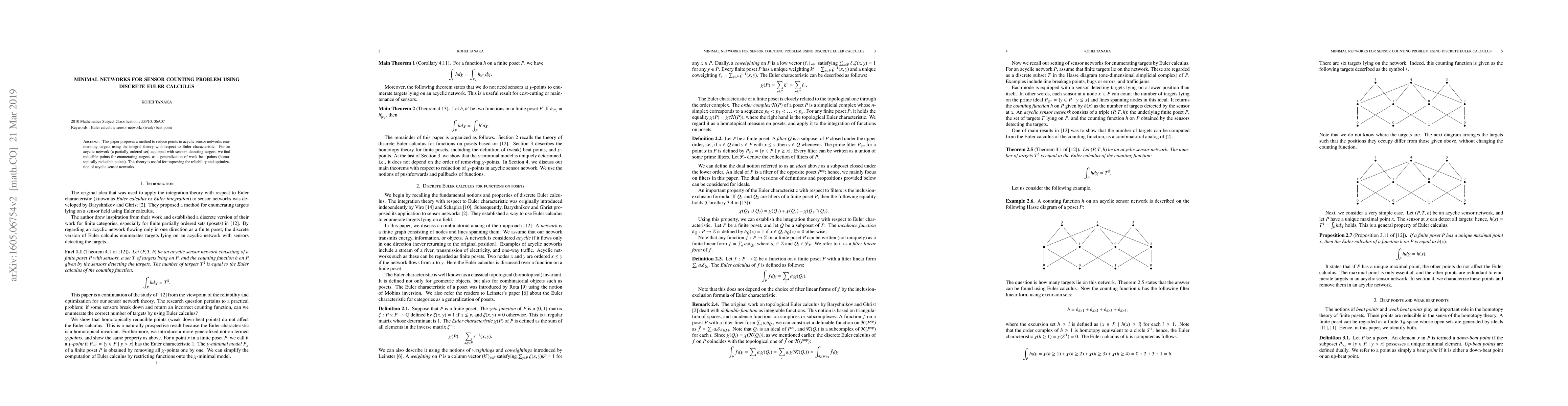 This paper introduces a method to minimize noise in acyclic sensor networks by employing discrete Euler calculus to identify reducible points, enhancing the reliability and optimization of such networks. The approach generalizes weak beat points and leverages integral theory with respect to Euler characteristic.