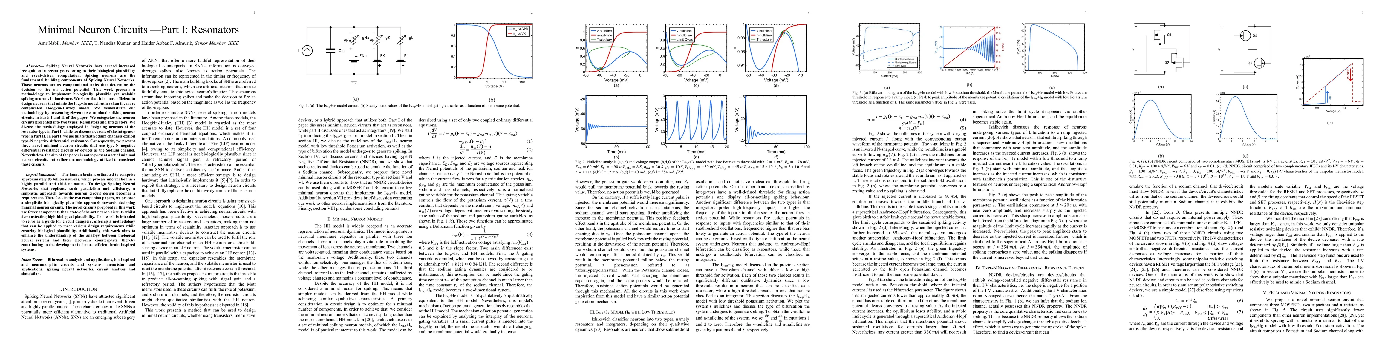 Spiking Neural Networks have earned increased recognition in recent years owing to their biological plausibility and event-driven computation. Spiking neurons are the fundamental building components of Spiking Neural Networks. Those neurons act as computational units that determine the decision to fire an action potential. This work presents a methodology to implement biologically plausible yet scalable spiking neurons in hardware. We show that it is more efficient to design neurons that mimic the $I_{Na,p}+I_{K}$ model rather than the more complicated Hodgkin-Huxley model. We demonstrate our methodology by presenting eleven novel minimal spiking neuron circuits in Parts I and II of the paper. We categorize the neuron circuits presented into two types: Resonators and Integrators. We discuss the methodology employed in designing neurons of the resonator type in Part I, while we discuss neurons of the integrator type in Part II. In part I, we postulate that Sodium channels exhibit type-N negative differential resistance. Consequently, we present three novel minimal neuron circuits that use type-N negative differential resistance circuits or devices as the Sodium channel. Nevertheless, the aim of the paper is not to present a set of minimal neuron circuits but rather the methodology utilized to construct those circuits.