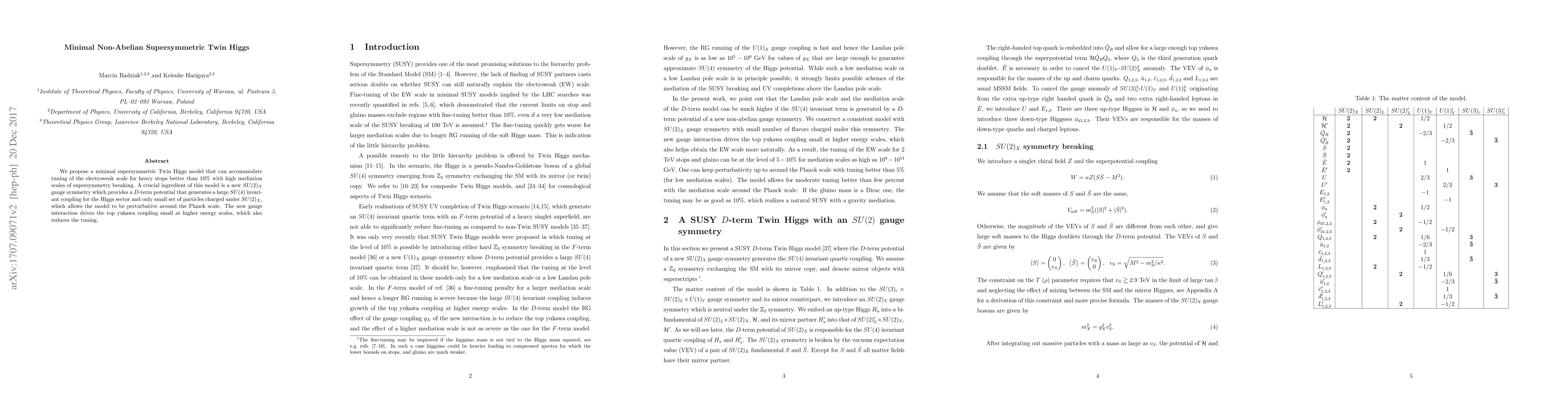We propose a minimal supersymmetric Twin Higgs model that can accommodate tuning of the electroweak scale for heavy stops better than 10% with high mediation scales of supersymmetry breaking. A crucial ingredient of this model is a new SU(2)_X gauge symmetry which provides a D-term potential that generates a large SU(4) invariant coupling for the Higgs sector and only small set of particles charged under SU(2)_X, which allows the model to be perturbative around the Planck scale. The new gauge interaction drives the top yukawa coupling small at higher energy scales, which also reduces the tuning.