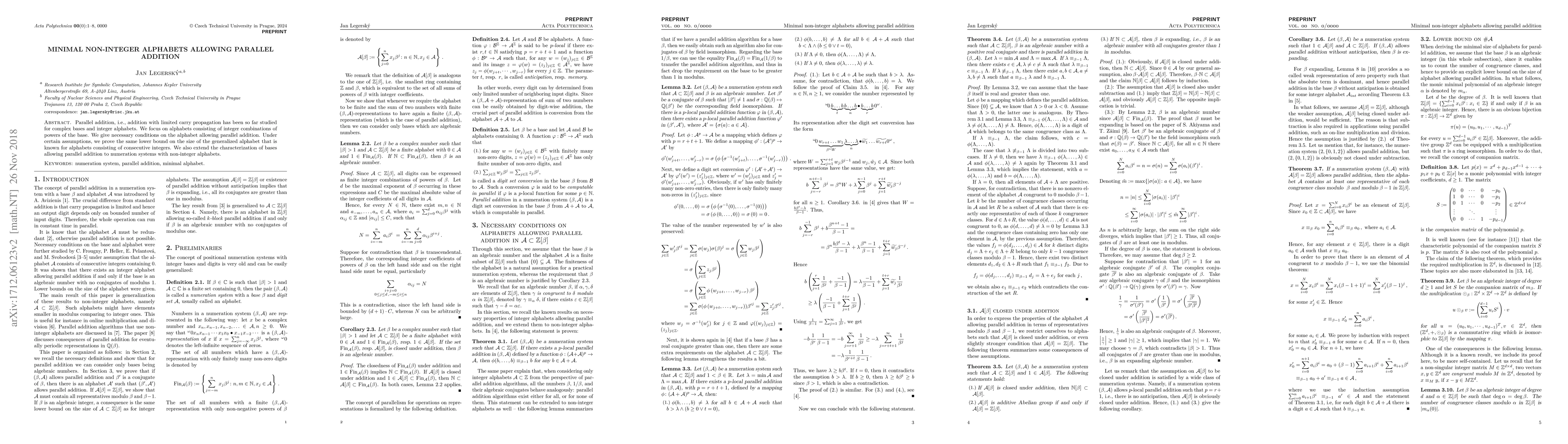 Parallel addition, i.e., addition with limited carry propagation, has been so far studied for complex bases and integer alphabets. We focus on alphabets consisting of integer combinations of powers of the base. We give necessary conditions on the alphabet allowing parallel addition. Under certain assumptions, we prove the same lower bound on the size of the generalized alphabet that is known for alphabets consisting of consecutive integers. We also extend the characterization of bases allowing parallel addition to numeration systems with non-integer alphabets.