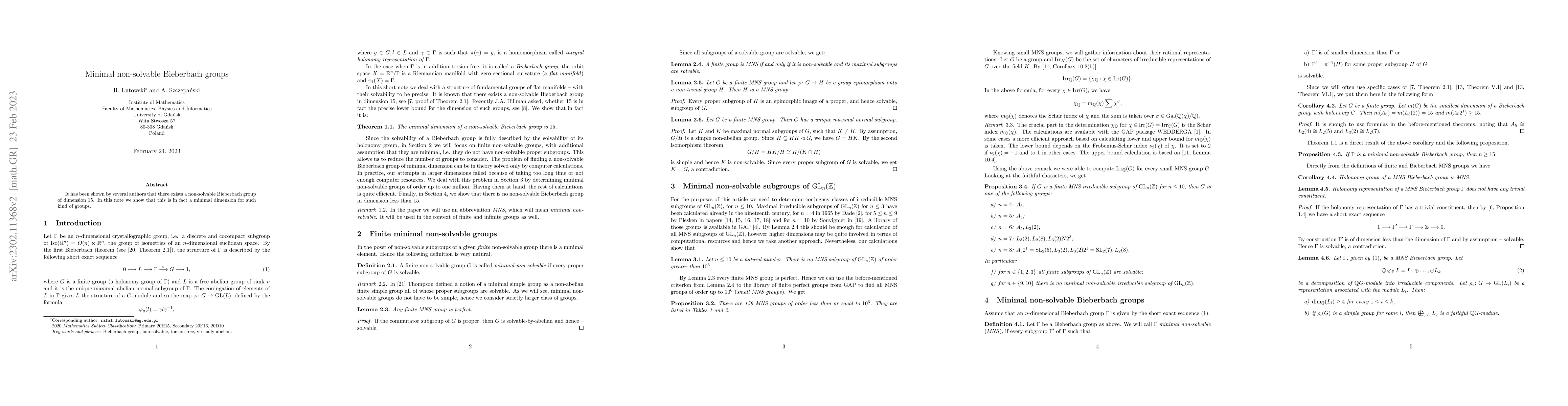 Summary: This paper demonstrates that the dimension $15$ is the smallest possible for non-solvable Bieberbach groups, confirming the existence of such groups at this minimal dimension. The result highlights the unique structural properties of these groups.