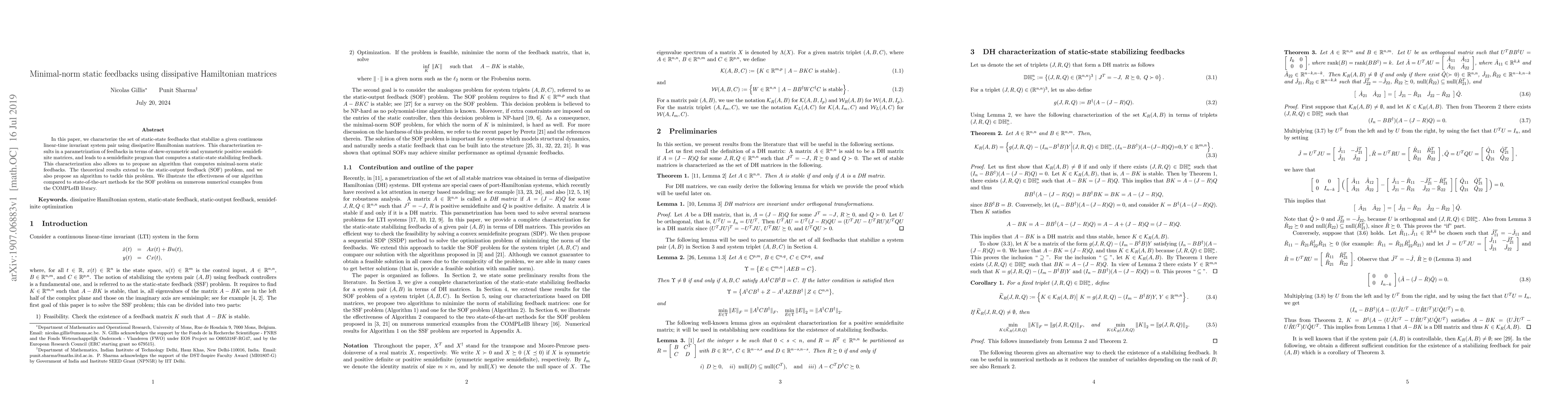 This paper characterizes static-state feedbacks that stabilize linear systems using dissipative Hamiltonian matrices, leading to a semidefinite program for minimal-norm feedback computation. It extends the approach to static-output feedback and provides algorithms for both problems, demonstrating effectiveness through numerical examples.