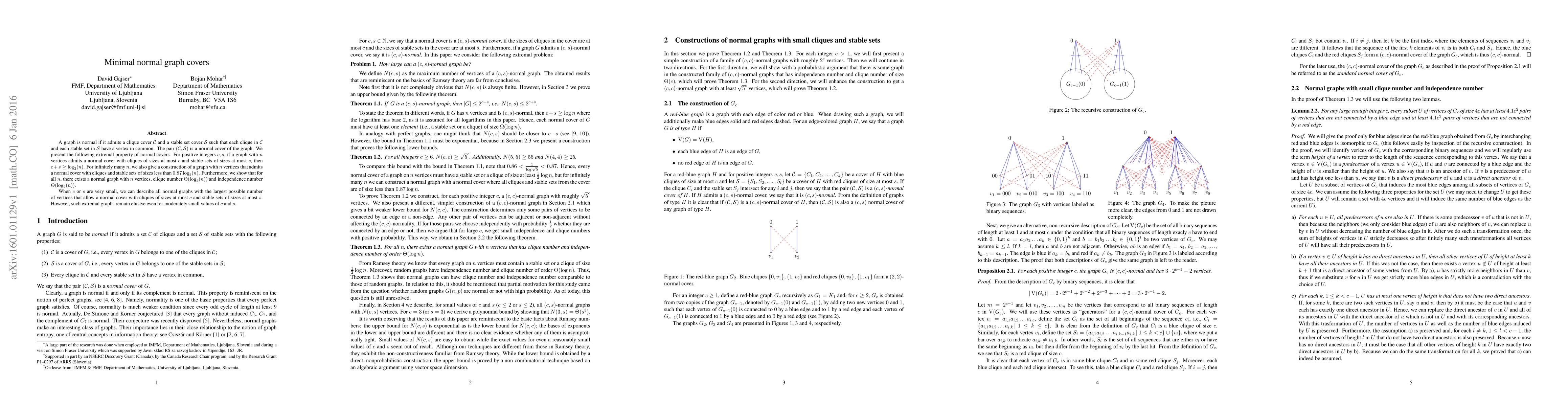 This research establishes an extremal property of normal covers in graph theory, stating that for graphs with n vertices, having clique sizes at most c and stable set sizes at most s, the sum c+s must be at least log_2(n). The paper also presents constructions for specific cases and identifies the existence of normal graphs with clique and independence numbers both Theta(log_2(n)). For very small c or s, the paper describes all relevant graphs, but extremal graphs for moderately small values remain unclear.