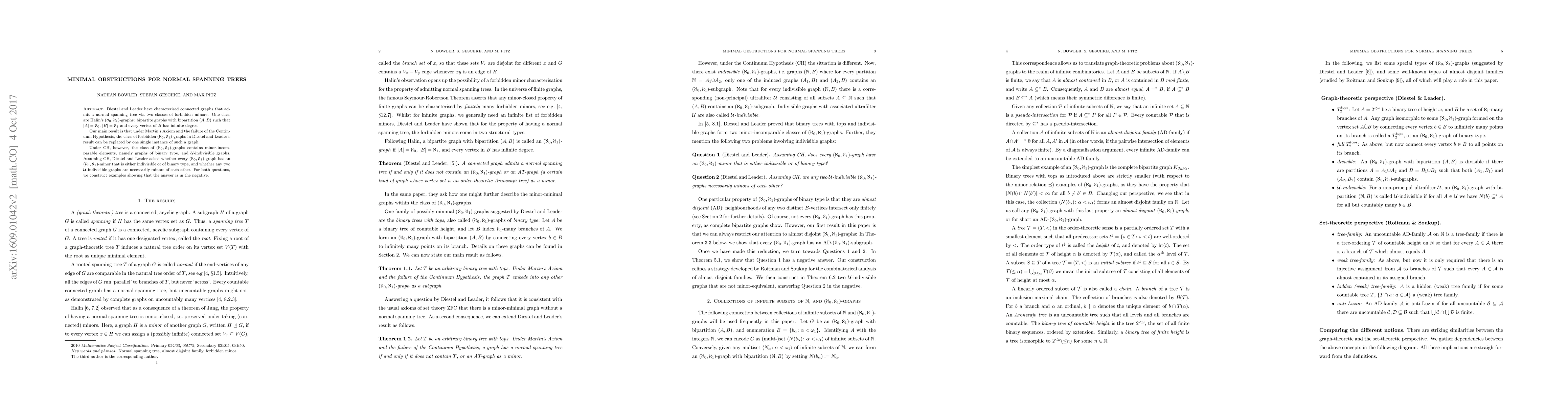 Diestel and Leader have characterised connected graphs that admit a normal spanning tree via two classes of forbidden minors. One class are Halin's $(\aleph_0,\aleph_1)$-graphs: bipartite graphs with bipartition $(\mathbb{N},B)$ such that $B$ is uncountable and every vertex of $B$ has infinite degree. Our main result is that under Martin's Axiom and the failure of the Continuum Hypothesis, the class of forbidden $(\aleph_0,\aleph_1)$-graphs in Diestel and Leader's result can be replaced by one single instance of such a graph. Under CH, however, the class of $(\aleph_0,\aleph_1)$-graphs contains minor-incomparable elements, namely graphs of binary type, and $\mathcal{U}$-indivisible graphs. Assuming CH, Diestel and Leader asked whether every $(\aleph_0,\aleph_1)$-graph has an $(\aleph_0,\aleph_1)$-minor that is either indivisible or of binary type, and whether any two $\mathcal{U}$-indivisible graphs are necessarily minors of each other. For both questions, we construct examples showing that the answer is in the negative.