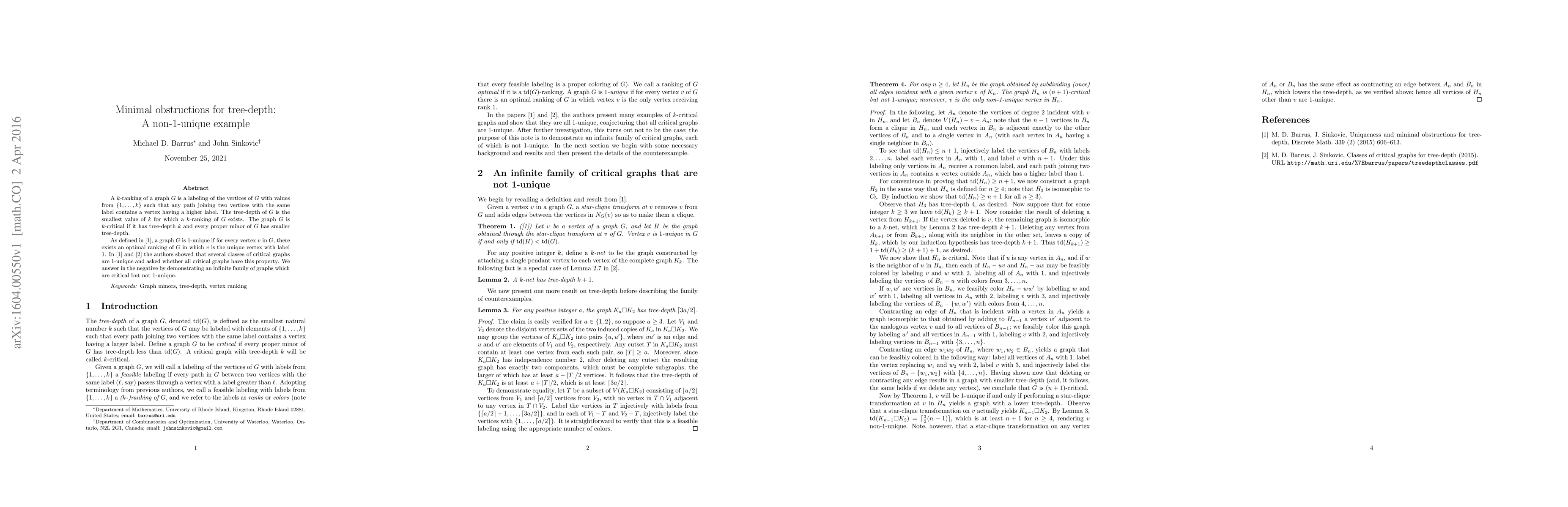 This paper disproves the conjecture that all k-critical graphs are 1-unique by presenting an infinite family of such graphs that lack the 1-unique property, thereby introducing minimal obstructions for tree-depth beyond the previously known 1-unique examples.