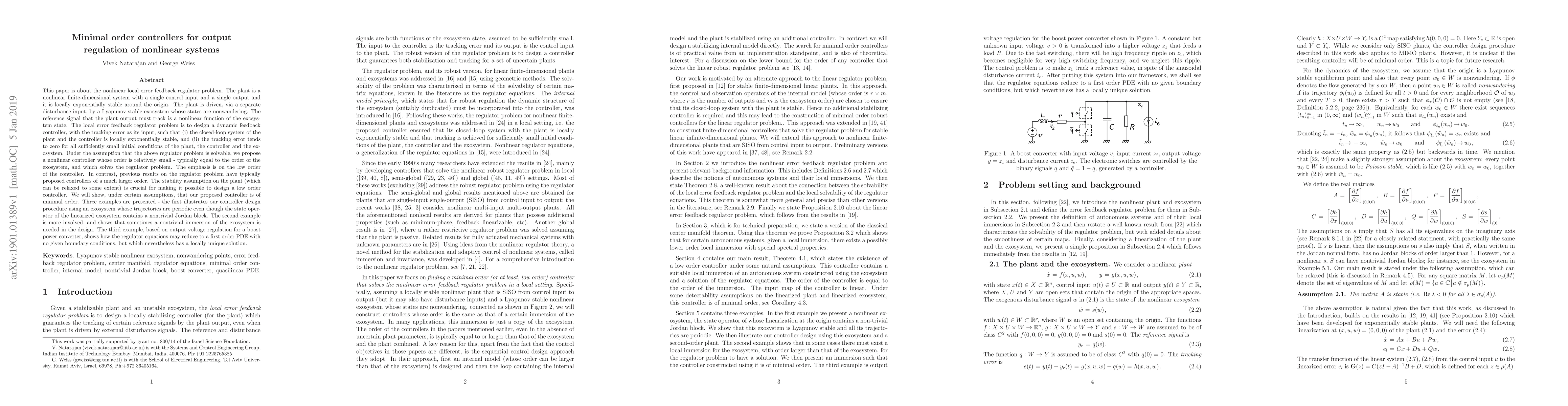 This paper presents a new approach to designing minimal order controllers for output regulation of nonlinear systems, ensuring local exponential stability and tracking of non-linear reference signals, with potential applications in power electronics and control systems.