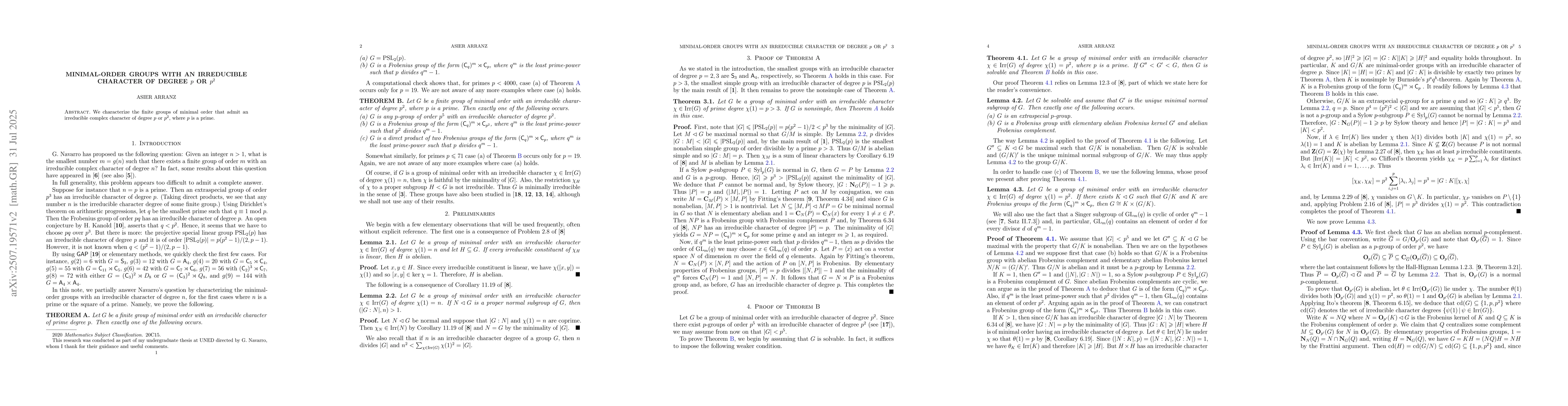 We characterize the finite groups of minimal order that admit an irreducible complex character of degree $p$ or $p^2$, where $p$ is a prime.