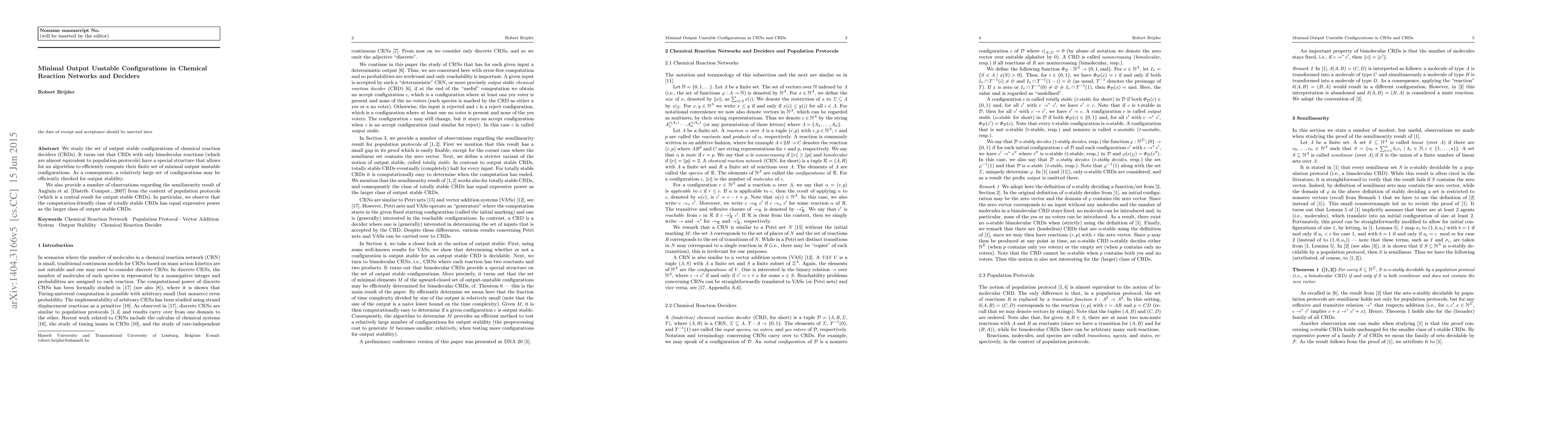 Researchers studied output stable configurations in chemical reaction deciders (CRDs) with bimolecular reactions, finding a way to efficiently compute minimal unstable configurations and observing the expressive power of totally stable CRDs.