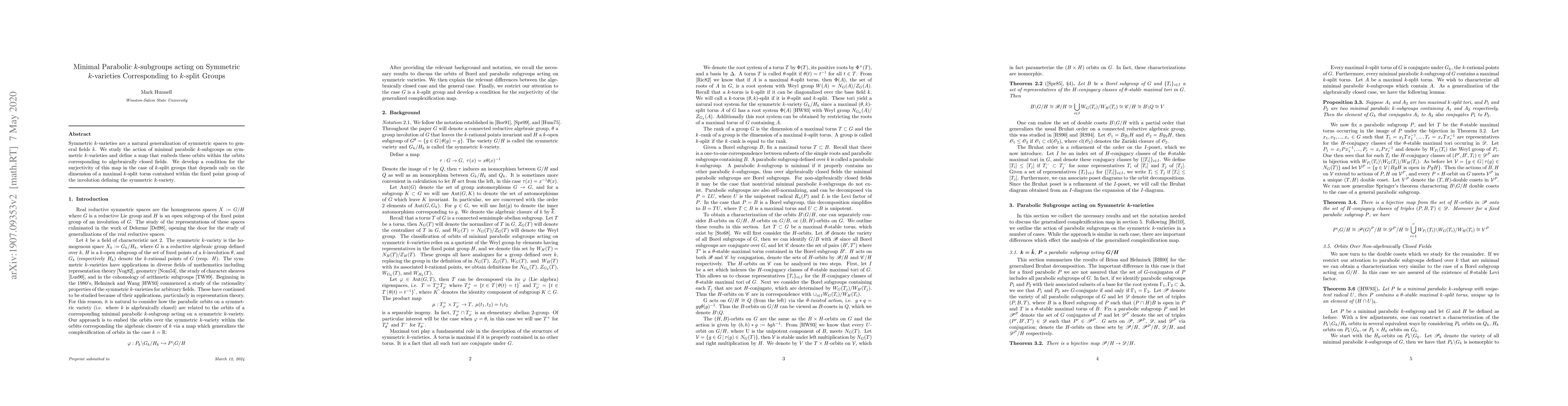 Symmetric $k$-varieties are a natural generalization of symmetric spaces to general fields $k$. We study the action of minimal parabolic $k$-subgroups on symmetric $k$-varieties and define a map that embeds these orbits within the orbits corresponding to algebraically closed fields. We develop a condition for the surjectivity of this map in the case of $k$-split groups that depends only on the dimension of a maximal $k$-split torus contained within the fixed point group of the involution defining the symmetric $k$-variety.