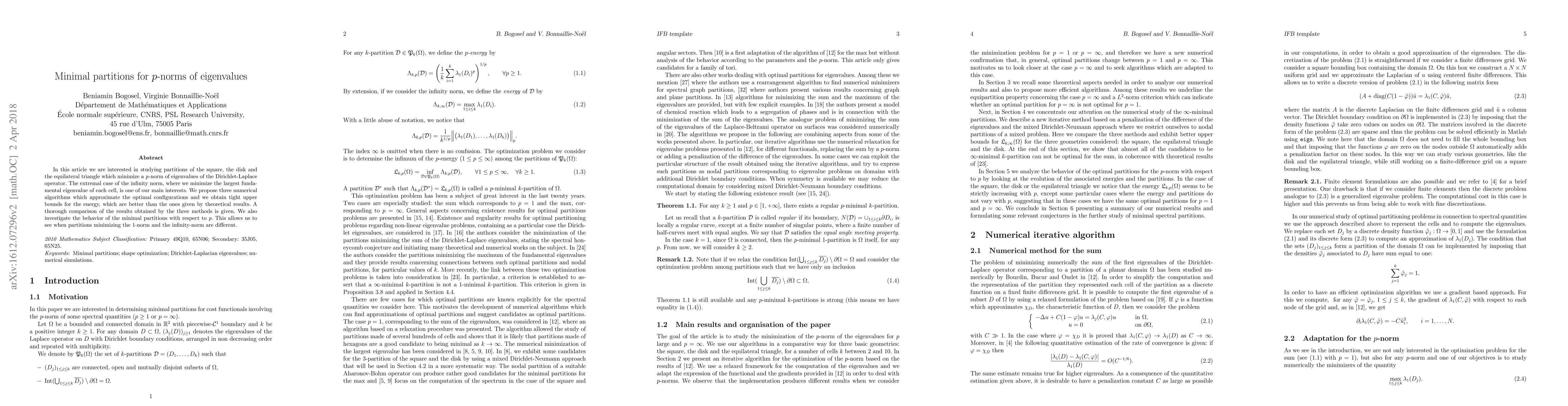 In this article we are interested in studying partitions of the square, the disk and the equilateral triangle which minimize a p-norm of eigenvalues of the Dirichlet-Laplace operator. The extremal case of the infinity norm, where we minimize the largest fundamental eigenvalue of each cell, is one of our main interests. We propose three numerical algorithms which approximate the optimal configurations and we obtain tight upper bounds for the energy, which are better than the ones given by theoretical results. A thorough comparison of the results obtained by the three methods is given. We also investigate the behavior of the minimal partitions with respect to p. This allows us to see when partitions minimizing the 1-norm and the infinity-norm are different.