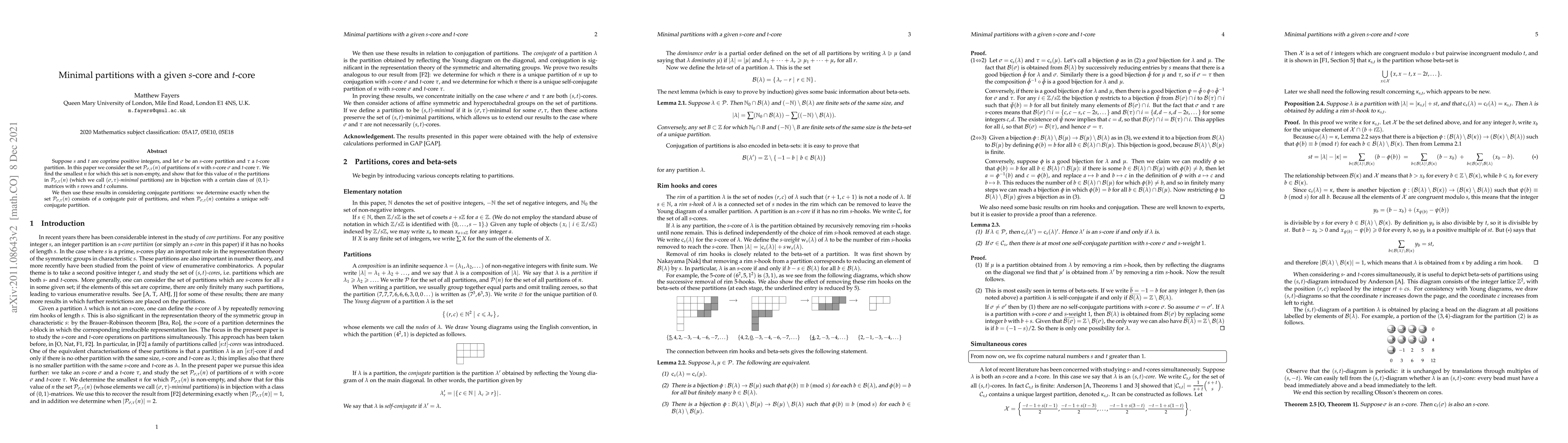 This paper investigates partitions with specified $s$-core $\sigma$ and $t$-core $\tau$ where $s$ and $t$ are coprime. It finds the smallest $n$ such that partitions exist with both cores and shows a bijection between these minimal partitions and a specific class of $(0,1)$-matrices. It also explores the conditions under which these partitions form conjugate pairs or unique self-conjugate partitions.
