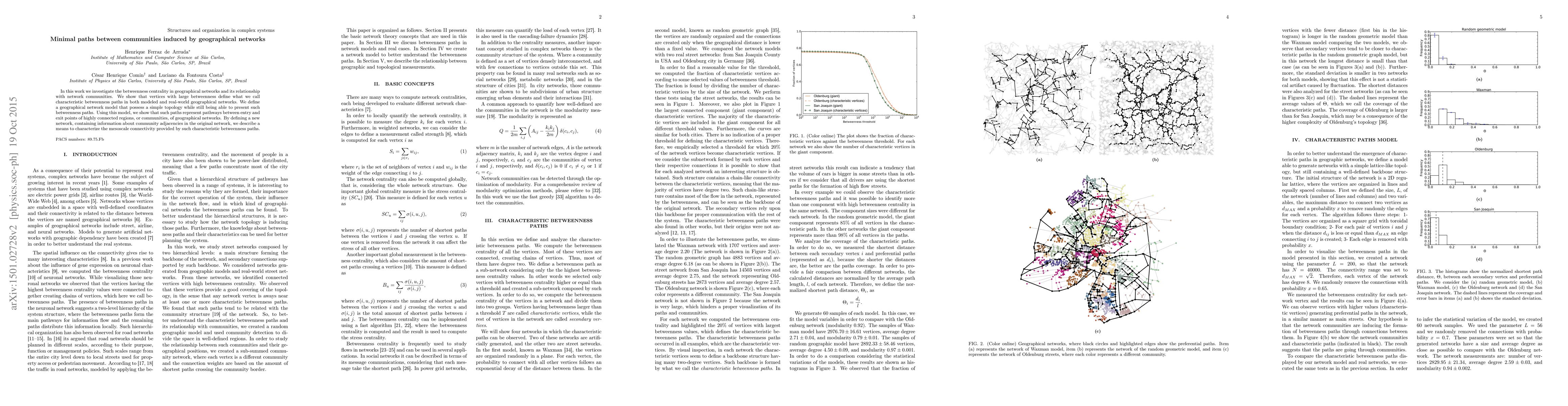 In this work we investigate the betweenness centrality in geographical networks and its relationship with network communities. We show that vertices with large betweenness define what we call characteristic betweenness paths in both modeled and real-world geographical networks. We define a geographical network model that possess a simple topology while still being able to present such betweenness paths. Using this model, we show that such paths represent pathways between entry and exit points of highly connected regions, or communities, of geographical networks. By defining a new network, containing information about community adjacencies in the original network, we describe a means to characterize the mesoscale connectivity provided by such characteristic betweenness paths.