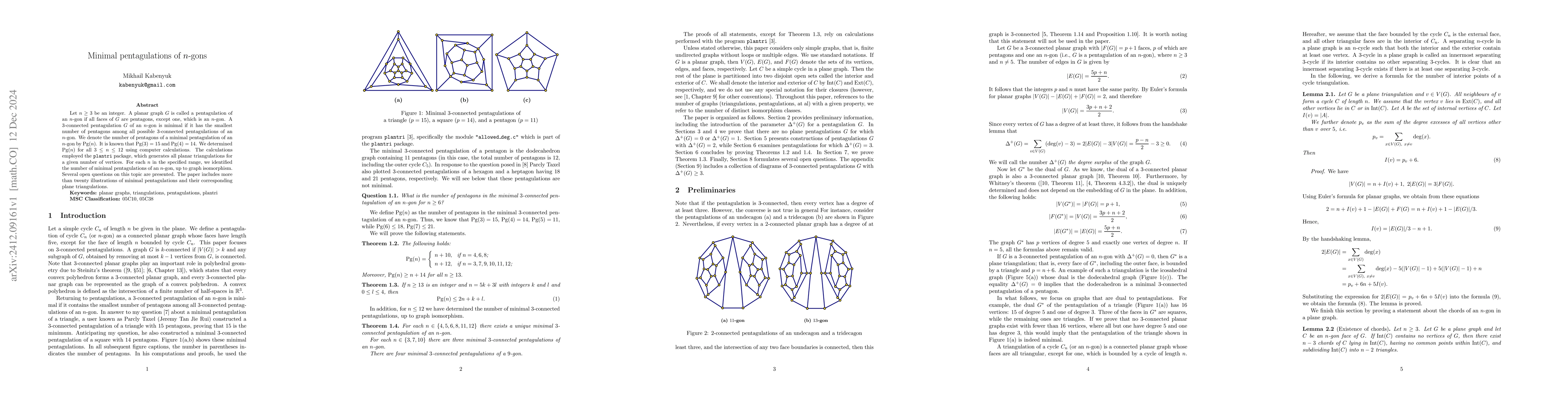 The research uses computer calculations with the plantri package to determine all minimal pentagulations of n-gons for n such that 3 ≤ n ≤ 12. The study also employs Lemmas and proof techniques to analyze the structure of 3-connected pentagulations.