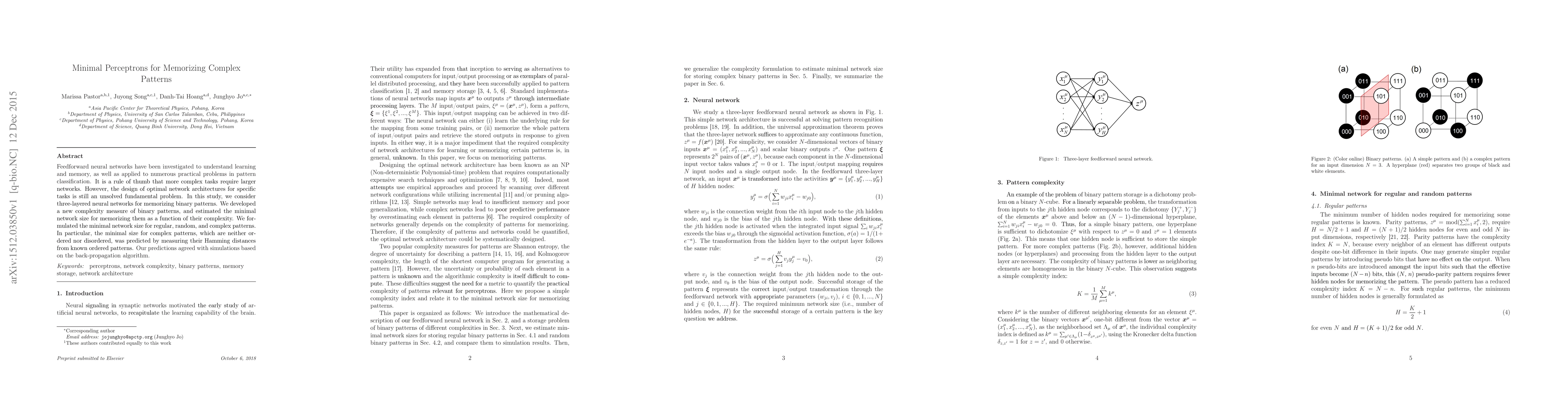 This research introduces a new method to estimate the minimal network size required for three-layered neural networks to memorize binary patterns. It defines a complexity measure based on Hamming distances from known ordered patterns, predicting minimal sizes for regular, random, and especially complex patterns, corroborated by back-propagation simulations.