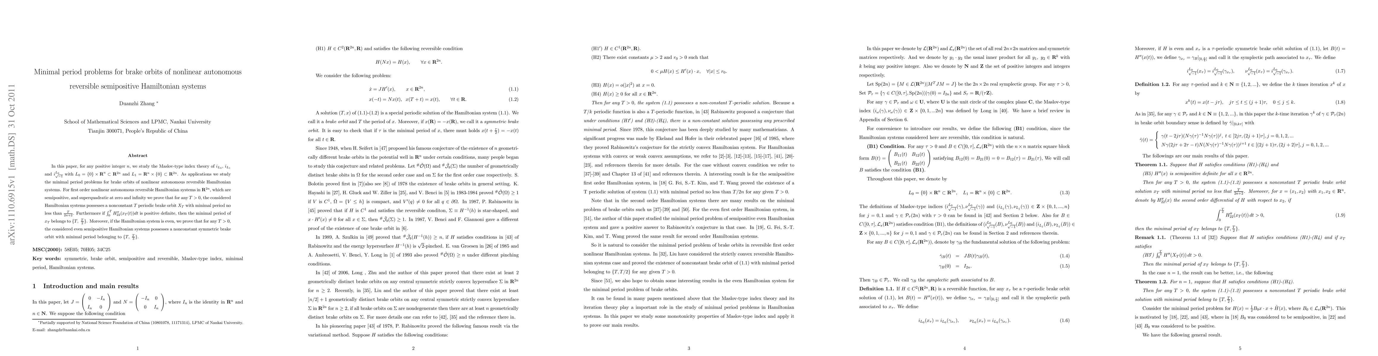 In this paper, for any positive integer $n$, we study the Maslov-type index theory of $i_{L_0}$, $i_{L_1}$ and $i_{\sqrt{-1}}^{L_0}$ with $L_0=\{0\}\times \R^n\subset \R^{2n}$ and $L_1=\R^n\times \{0\} \subset \R^{2n}$. As applications we study the minimal period problems for brake orbits of nonlinear autonomous reversible Hamiltonian systems. For first order nonlinear autonomous reversible Hamiltonian systems in $\R^{2n}$, which are semipositive, and superquadratic at zero and infinity, we prove that for any $T>0$, the considered Hamiltonian systems possesses a nonconstant $T$ periodic brake orbit $X_T$ with minimal period no less than $\frac{T}{2n+2}$. Furthermore if $\int_0^T H"_{22}(x_T(t))dt$ is positive definite, then the minimal period of $x_T$ belongs to $\{T,\;\frac{T}{2}\}$. Moreover, if the Hamiltonian system is even, we prove that for any $T>0$, the considered even semipositive Hamiltonian systems possesses a nonconstant symmetric brake orbit with minimal period belonging to $\{T,\;\frac{T}{3}\}$