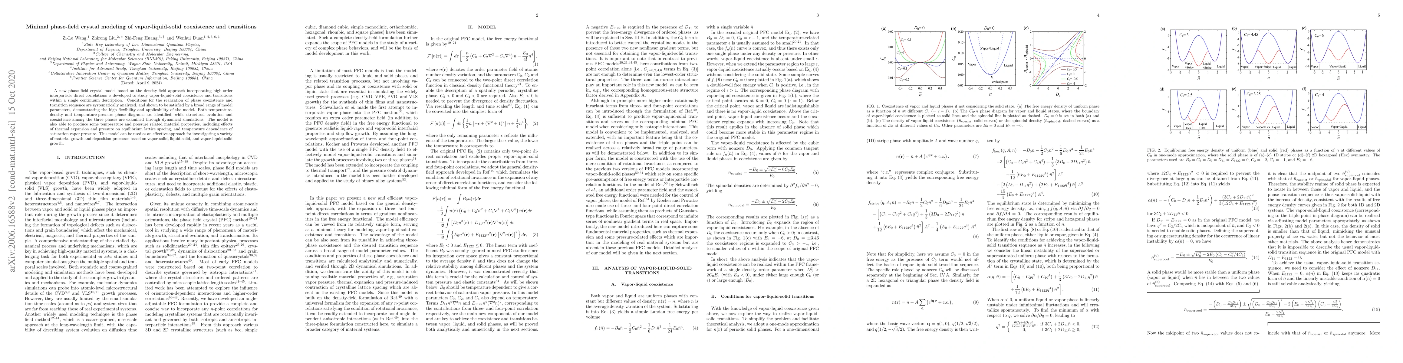 This paper develops a minimal phase-field crystal model to study vapor-liquid-solid coexistence and transitions, analyzing conditions for phase coexistence and examining structural evolution via simulations. The model effectively captures material properties and can be applied to various material growth processes.