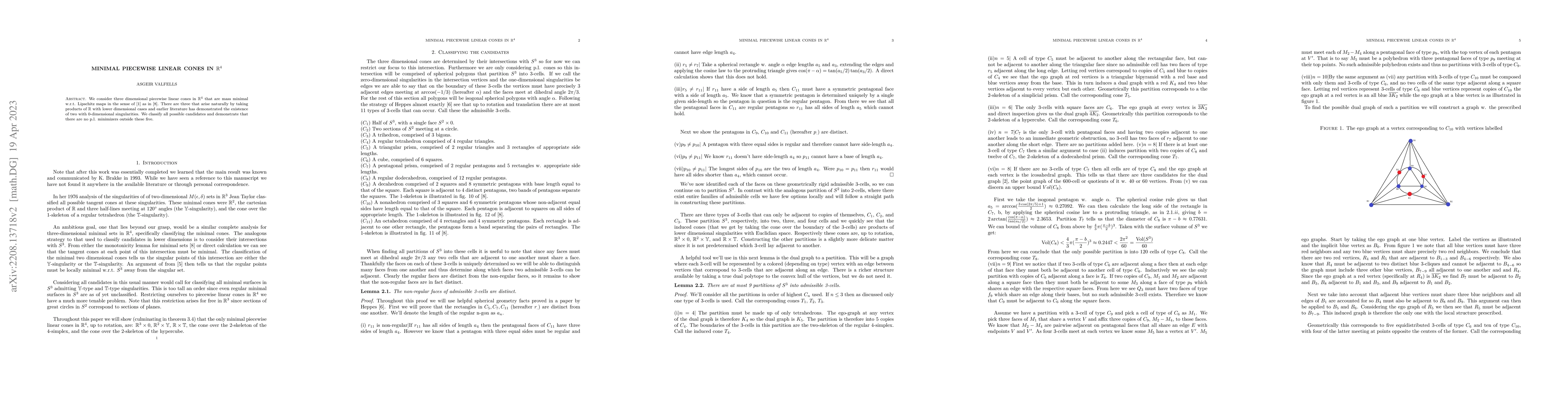 The paper classifies and eliminates candidates for minimal piecewise linear cones in $\mathbb{R}^4$, using geometric arguments, spherical geometry, and Lipschitz mass minimization principles.