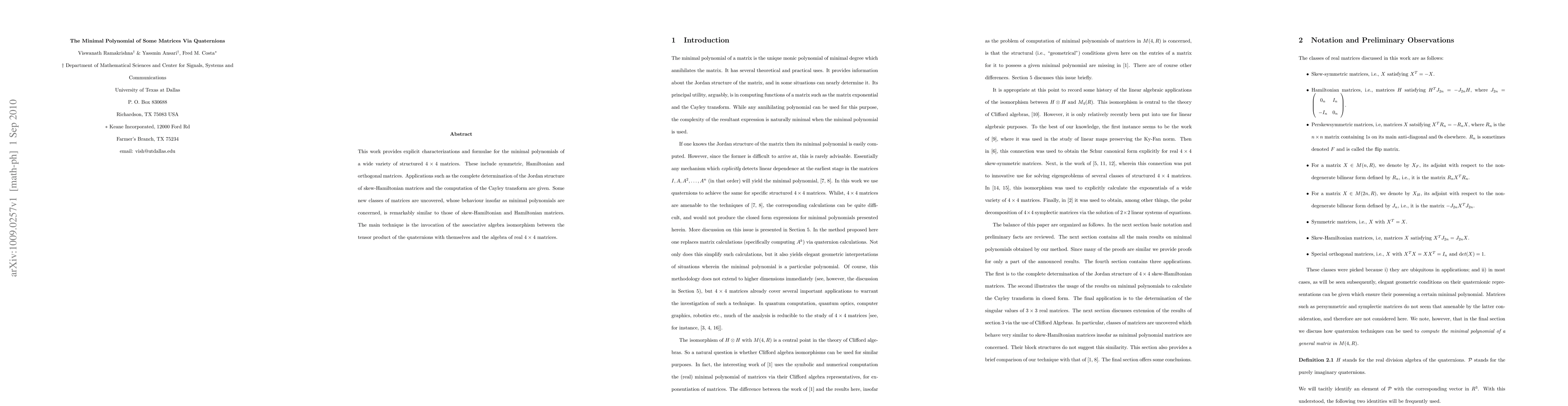 This paper characterizes minimal polynomials for various structured $4\times 4$ matrices, including symmetric, Hamiltonian, and orthogonal types, using the quaternion algebra isomorphism. It also reveals new matrix classes with similar minimal polynomial behavior.