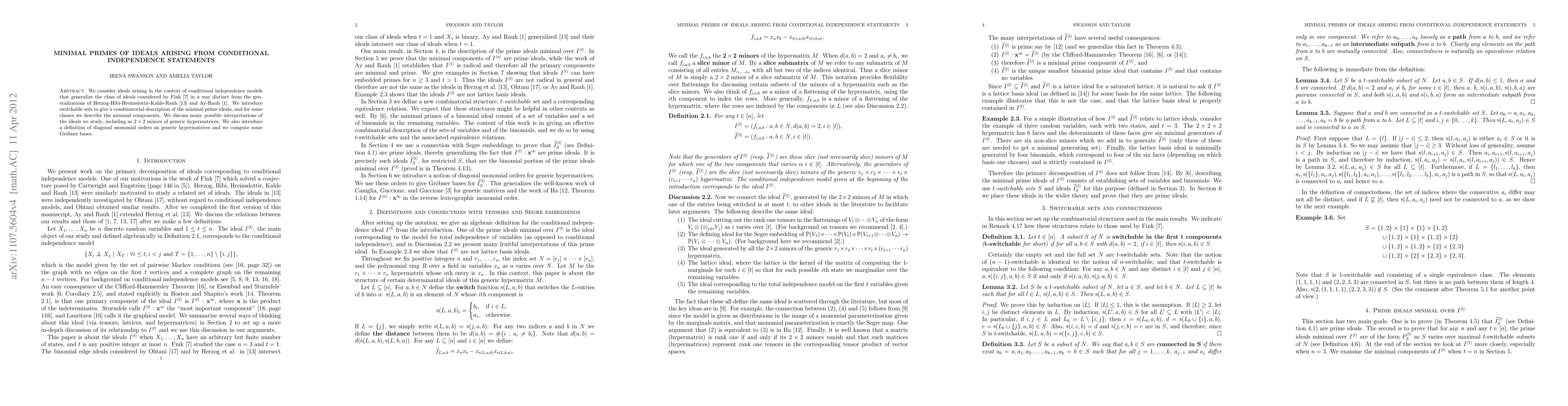 This paper studies ideals derived from conditional independence models, introducing switchable sets to describe minimal prime ideals. It explores various interpretations of these ideals, including as 2×2 minors of generic hypermatrices, and computes Groebner bases for certain diagonal monomial orders.