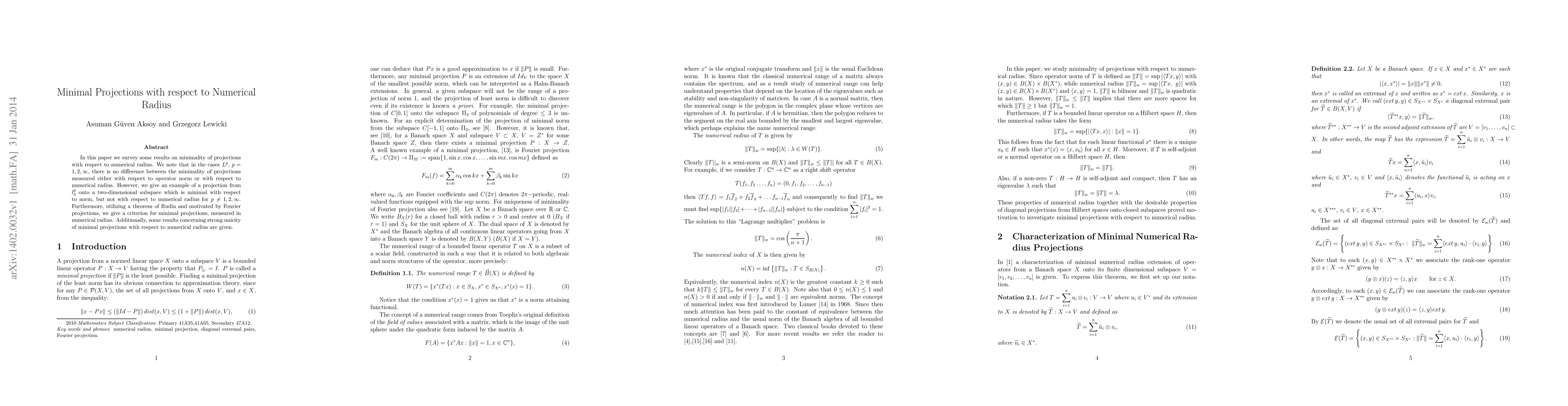 This paper surveys results on minimal projections with respect to numerical radius, showing no difference in minimality between operator norm and numerical radius in $L^p$ spaces for $p=1,2,\infty$. It provides an example of a projection in $l^p_3$ that is minimal with respect to norm but not numerical radius for $p\neq 1,2,\infty$, and offers a criterion for minimal projections using a theorem by Rudin.