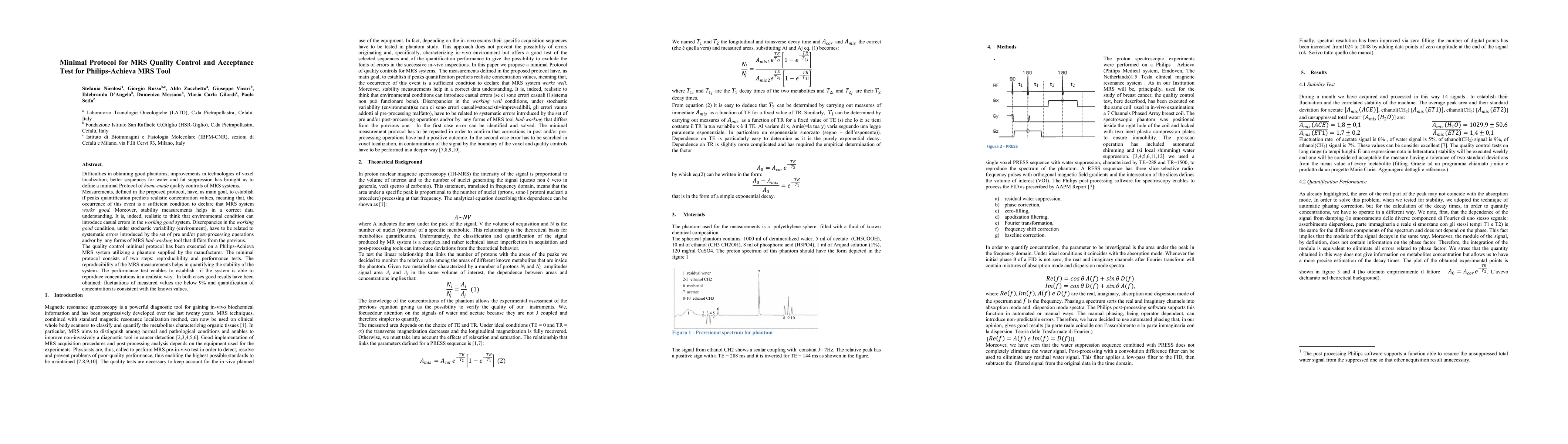 Difficulties in obtaining good phantoms, improvements in technologies of voxel localization, better sequences for water and fat suppression has brought us to define a minimal Protocol of home-made quality controls of MRS systems. Measurements, defined in the proposed protocol, have, as main goal, to establish if peaks quantification predicts realistic concentration values, meaning that, the occurrence of this event is a sufficient condition to declare that MRS system works good. Moreover, stability measurements helps in a correct data understanding. It is, indeed, realistic to think that environmental condition can introduce casual errors in the working good system. Discrepancies in the working good condition, under stochastic variability (environment), have to be related to systematic errors introduced by the set of pre and/or post-processing operations and/or by any forms of MRS bad-working tool that differs from the previous. The quality control minimal protocol has been executed on a Philips-Achieva MRS system utilizing a phantom supplied by the manufacturer. The minimal protocol consists of two steps: reproducibility and performance tests. The reproducibility of the MRS measurements helps in quantifying the stability of the system. The performance test enables to establish if the system is able to reproduce concentrations in a realistic way. In both cases good results have been obtained: fluctuations of measured values are below 9% and quantification of concentration is consistent with the known values.
