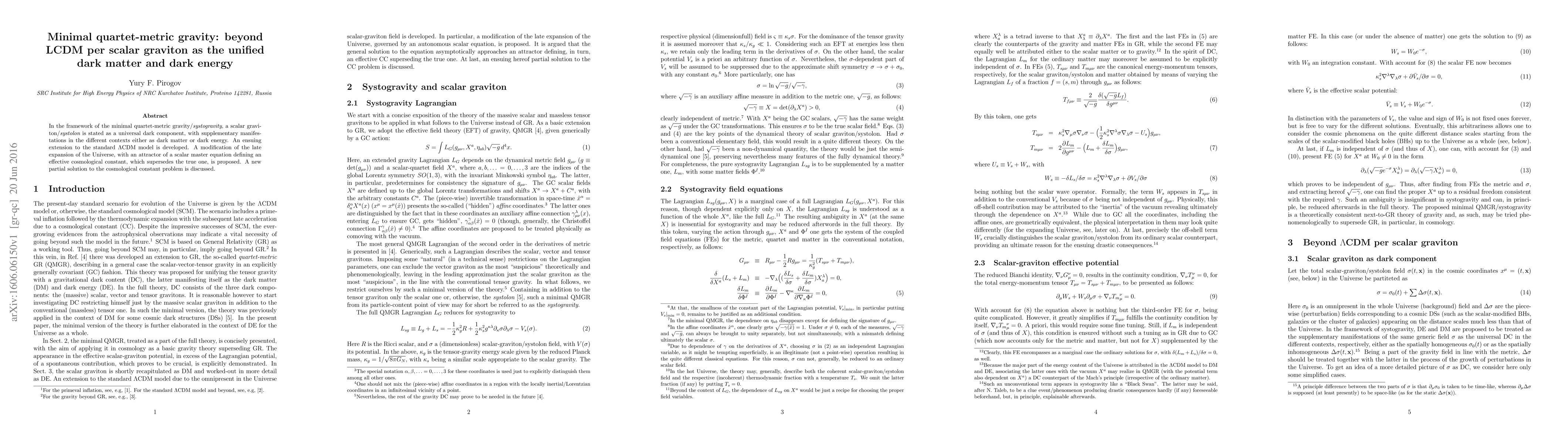 The paper introduces minimal quartet-metric gravity, proposing a scalar graviton as a unified dark matter and dark energy solution. It extends the standard ΛCDM model, suggesting a late universe expansion modification with a scalar master equation acting as an effective cosmological constant, offering a new perspective on the cosmological constant problem.