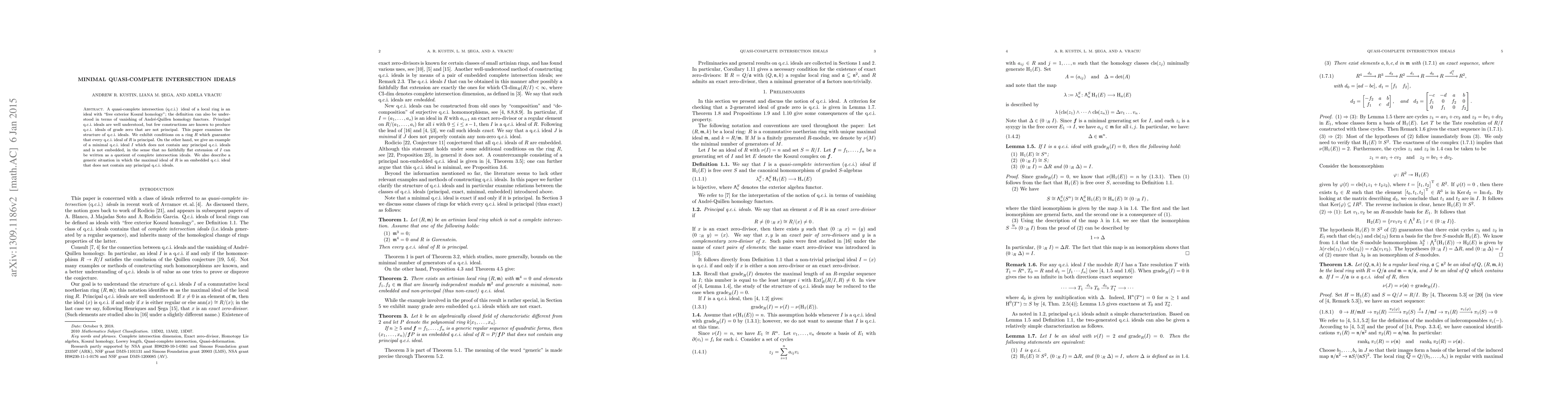 A quasi-complete intersection (q.c.i.) ideal of a local ring is an ideal with "free exterior Koszul homology"; the definition can also be understood in terms of vanishing of Andr\'e-Quillen homology functors. Principal q.c.i. ideals are well understood, but few constructions are known to produce q.c.i. ideals of grade zero that are not principal. This paper examines the structure of q.c.i. ideals. We exhibit conditions on a ring $R$ which guarantee that every q.c.i. ideal of $R$ is principal. On the other hand, we give an example of a minimal q.c.i. deal $I$ which does not contain any principal q.c.i. ideals and is not embedded, in the sense that no faithfully flat extension of $I$ can be written as a quotient of complete intersection ideals. We also describe a generic situation in which the maximal ideal of $R$ is an embedded q.c.i. ideal that does not contain any principal q.c.i. ideals.