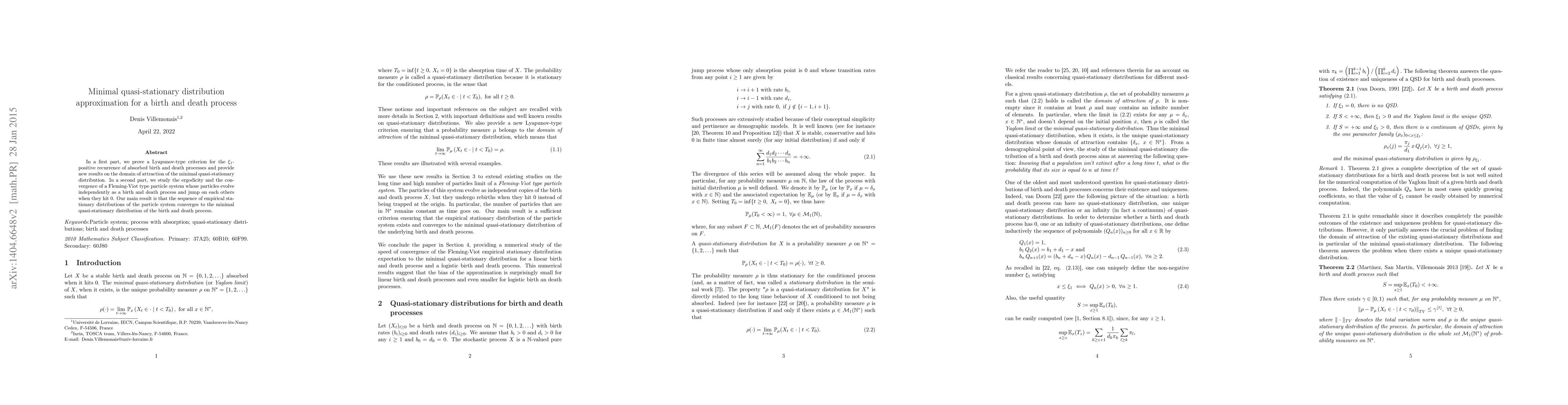 In a first part, we prove a Lyapunov-type criterion for the $\xi\_1$-positive recurrence of absorbed birth and death processes and provide new results on the domain of attraction of the minimal quasi-stationary distribution. In a second part, we study the ergodicity and the convergence of a Fleming-Viot type particle system whose particles evolve independently as a birth and death process and jump on each others when they hit $0$. Our main result is that the sequence of empirical stationary distributions of the particle system converges to the minimal quasi-stationary distribution of the birth and death process.