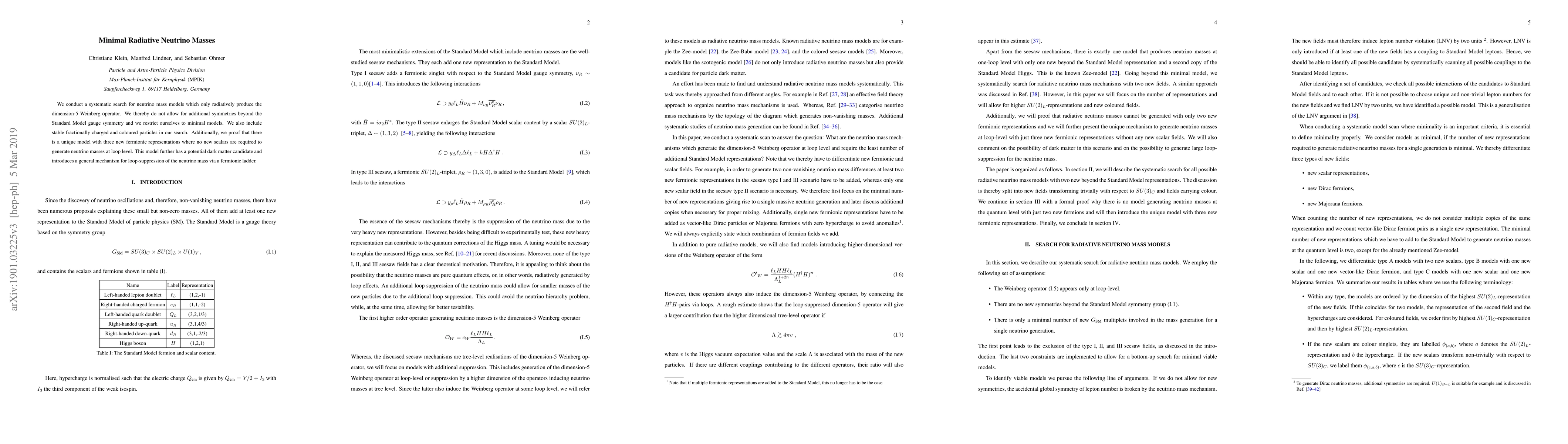 We conduct a systematic search for neutrino mass models which only radiatively produce the dimension-5 Weinberg operator. We thereby do not allow for additional symmetries beyond the Standard Model gauge symmetry and we restrict ourselves to minimal models. We also include stable fractionally charged and coloured particles in our search. Additionally, we proof that there is a unique model with three new fermionic representations where no new scalars are required to generate neutrino masses at loop level. This model further has a potential dark matter candidate and introduces a general mechanism for loop-suppression of the neutrino mass via a fermionic ladder