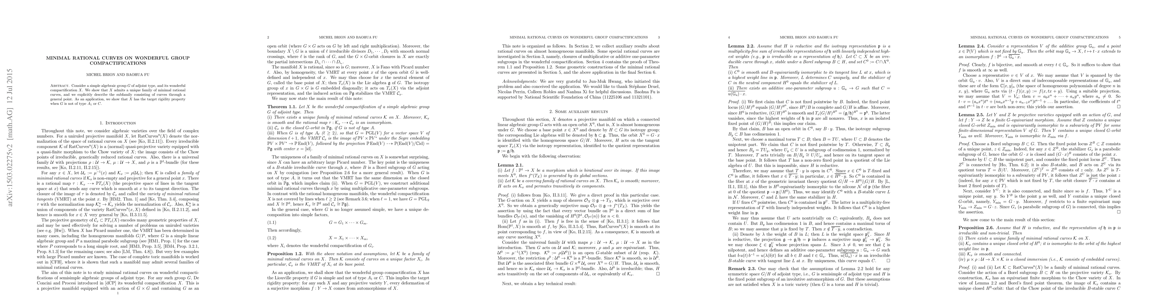 This paper demonstrates that a simple algebraic group G's wonderful compactification X has a unique family of minimal rational curves, with a detailed description of the curves passing through a general point. It also proves that X exhibits target rigidity when G is not of type A_1 or C.