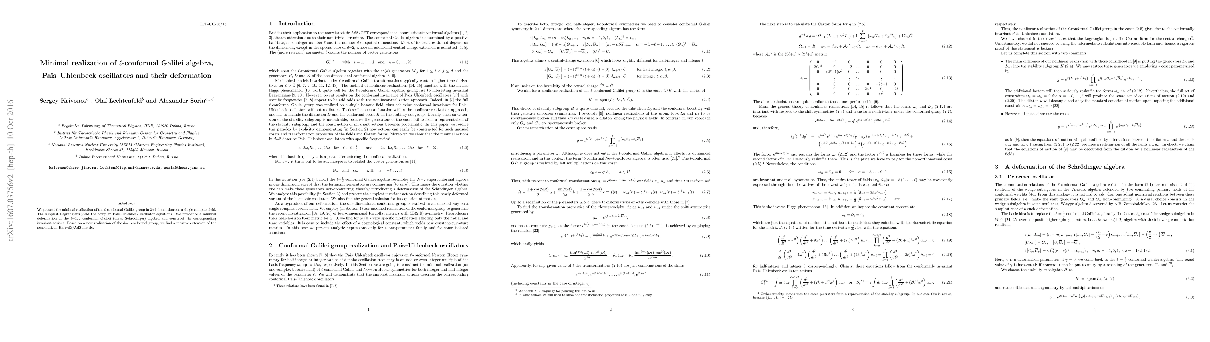 We present the minimal realization of the $\ell$-conformal Galilei group in 2+1 dimensions on a single complex field. The simplest Lagrangians yield the complex Pais-Uhlenbeck oscillator equations. We introduce a minimal deformation of the $\ell$=1/2 conformal Galilei (a.k.a. Schr\"odinger) algebra and construct the corresponding invariant actions. Based on a new realization of the d=1 conformal group, we find a massive extension of the near-horizon Kerr-dS/AdS metric.