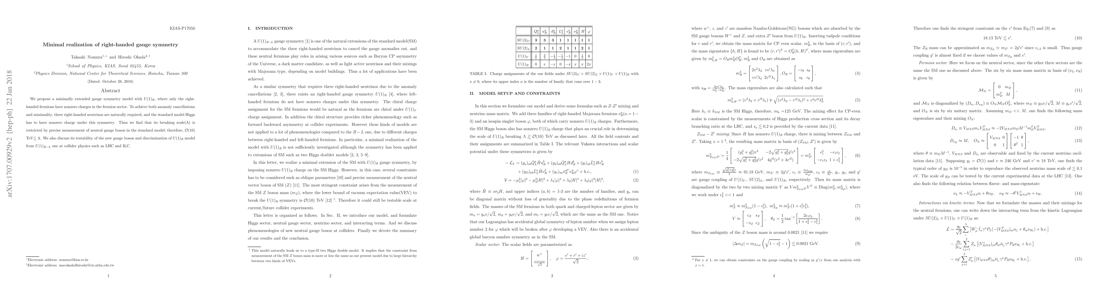 This paper proposes a minimal gauge symmetry model with $U(1)_R$ where only right-handed fermions carry nonzero charges, necessitating three right-handed neutrinos and a nonzero charge for the standard model Higgs. The breaking scale is constrained to be ${\cal O}$(10) TeV, and the model's testability at colliders like LHC and ILC is discussed for distinguishing it from $U(1)_{B-L}$ models.