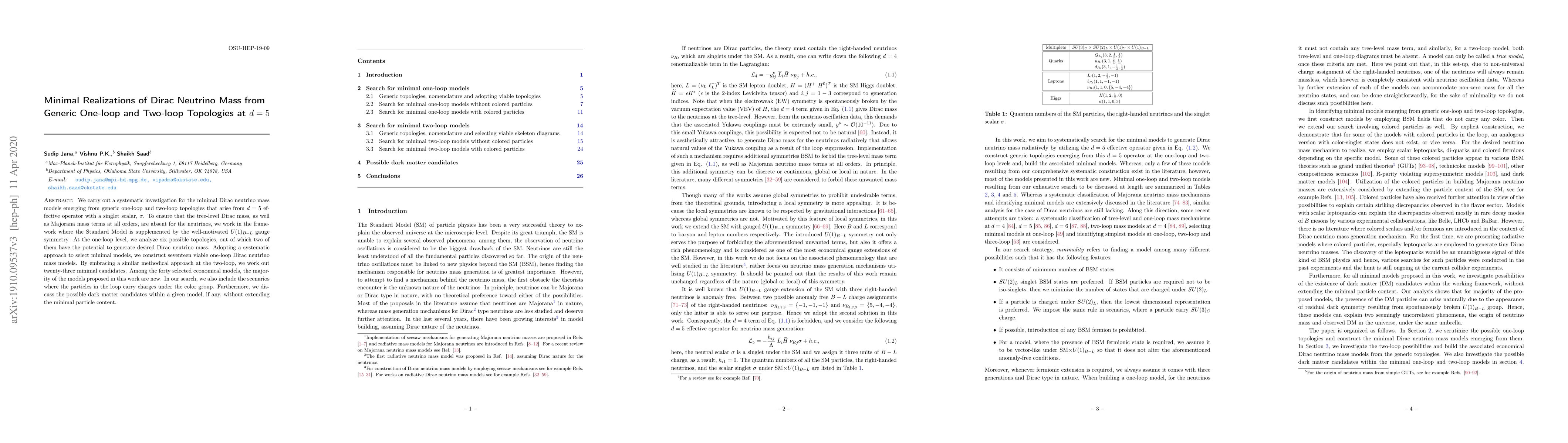 This paper systematically investigates minimal Dirac neutrino mass models from generic one-loop and two-loop topologies derived from $d=5$ effective operators, supplemented by $U(1)_{B-L}$ gauge symmetry to ensure no tree-level Dirac or Majorana masses. It identifies seventeen one-loop and twenty-three two-loop minimal models, most of which are new, and explores potential dark matter candidates within these frameworks.