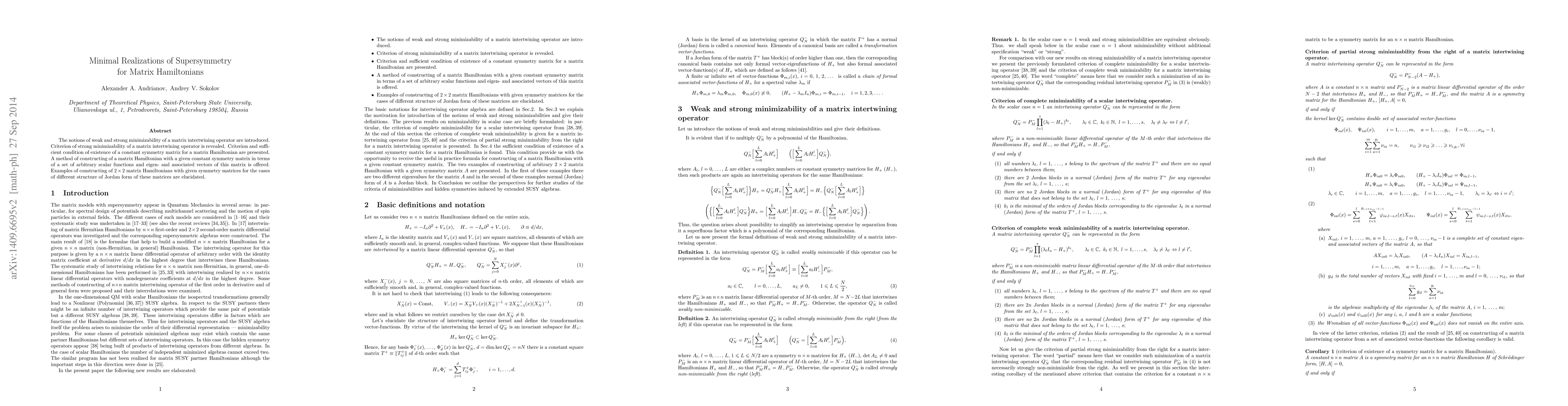 The notions of weak and strong minimizability of a matrix intertwining operator are introduced. Criterion of strong minimizability of a matrix intertwining operator is revealed. Criterion and sufficient condition of existence of a constant symmetry matrix for a matrix Hamiltonian are presented. A method of constructing of a matrix Hamiltonian with a given constant symmetry matrix in terms of a set of arbitrary scalar functions and eigen- and associated vectors of this matrix is offered. Examples of constructing of $2\times2$ matrix Hamiltonians with given symmetry matrices for the cases of different structure of Jordan form of these matrices are elucidated.