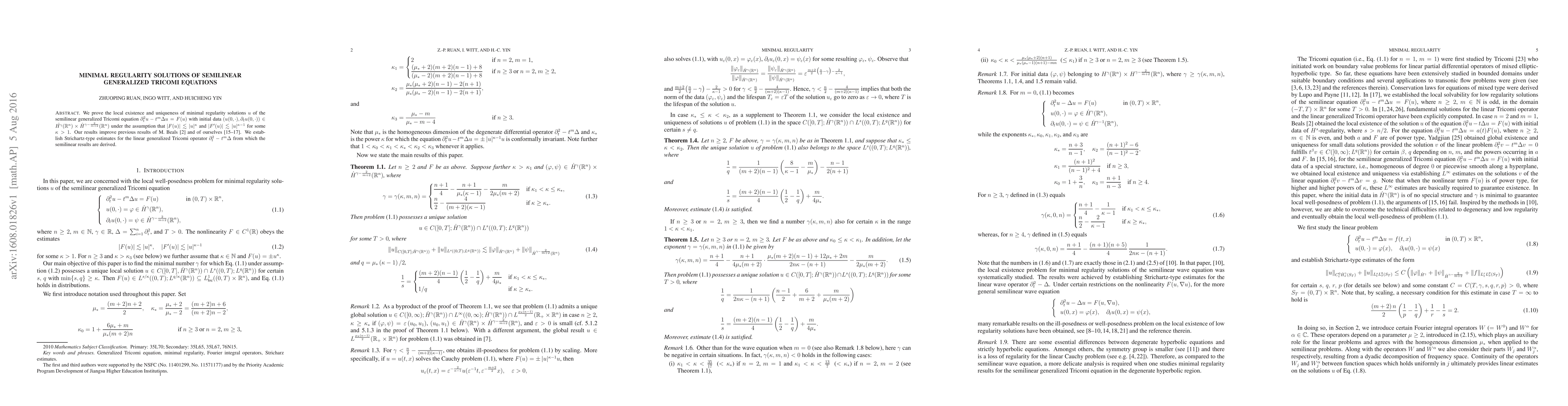 This paper proves the local existence and uniqueness of minimal regularity solutions for the semilinear generalized Tricomi equation, improving upon previous results. It establishes Strichartz-type estimates for the linear operator, which are used to derive the semilinear results.