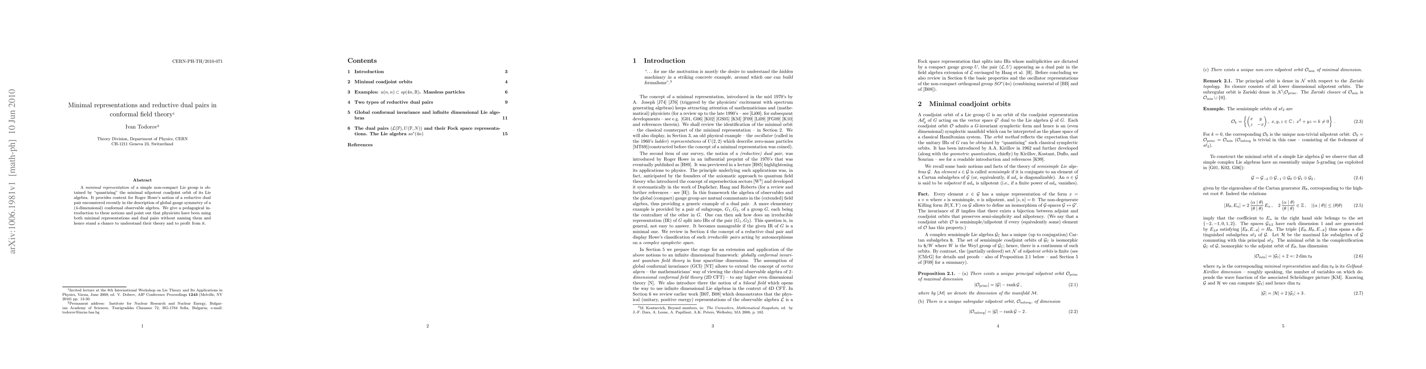 A minimal representation of a simple non-compact Lie group is obtained by ``quantizing'' the minimal nilpotent coadjoint orbit of its Lie algebra. It provides context for Roger Howe's notion of a reductive dual pair encountered recently in the description of global gauge symmetry of a (4-dimensional) conformal observable algebra. We give a pedagogical introduction to these notions and point out that physicists have been using both minimal representations and dual pairs without naming them and hence stand a chance to understand their theory and to profit from it.