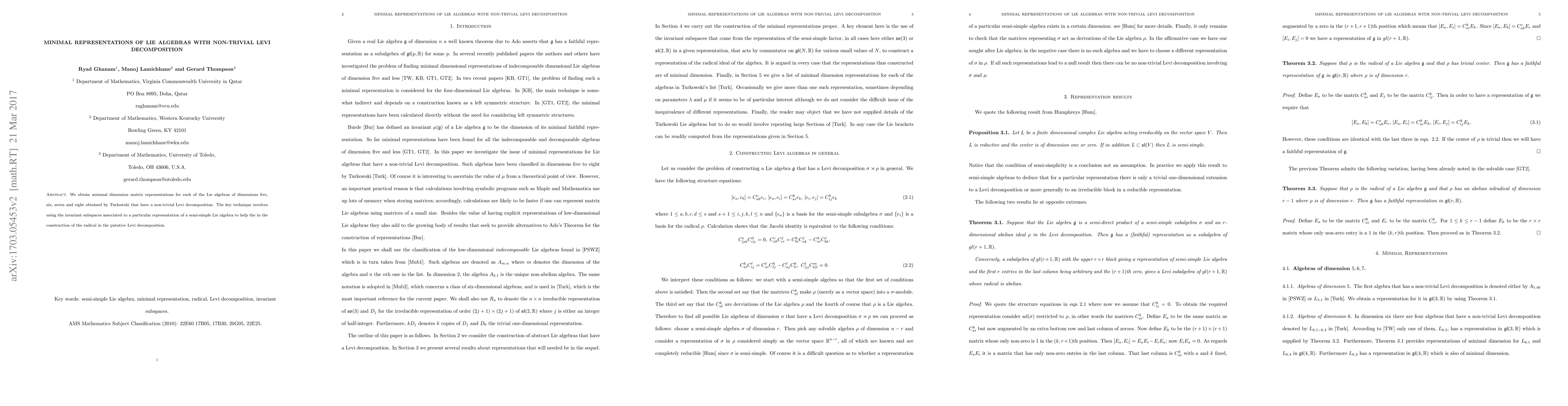 We obtain minimal dimension matrix representations for each of the Lie algebras of dimension five, six, seven, and eight obtained by Turkowski that have a non-trivial Levi decomposition. The Key technique involves using subspace associated to a particular representation of semi-simple Lie algebra to help in the construction of the radical in the putative Levi decomposition.