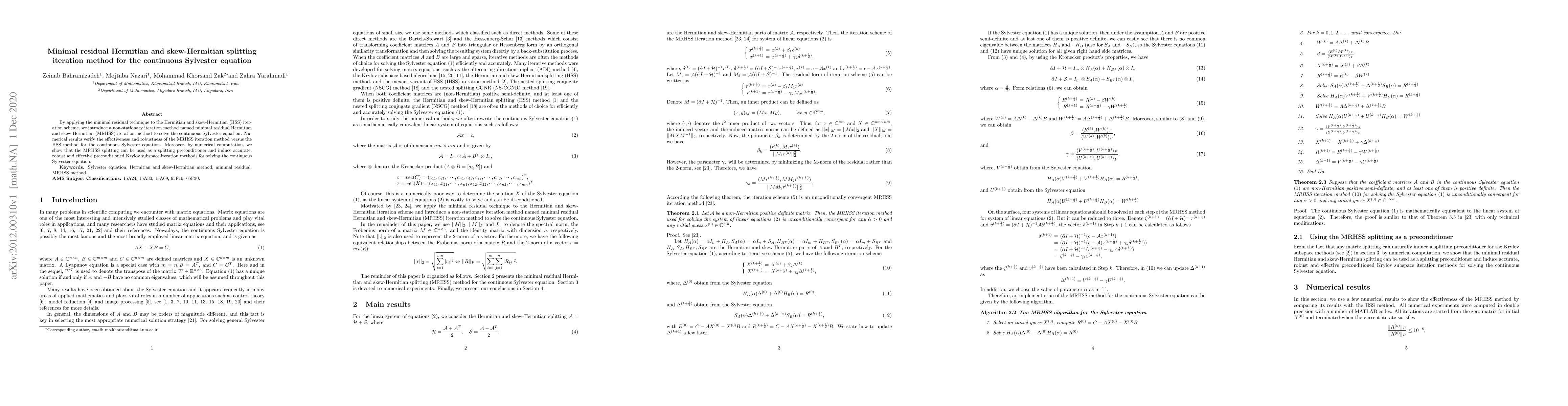 This paper introduces a minimal residual Hermitian and skew-Hermitian (MRHSS) iteration method for solving the continuous Sylvester equation, demonstrating its effectiveness and robustness compared to the traditional HSS method. The MRHSS splitting is also shown to be an effective preconditioner for Krylov subspace methods.