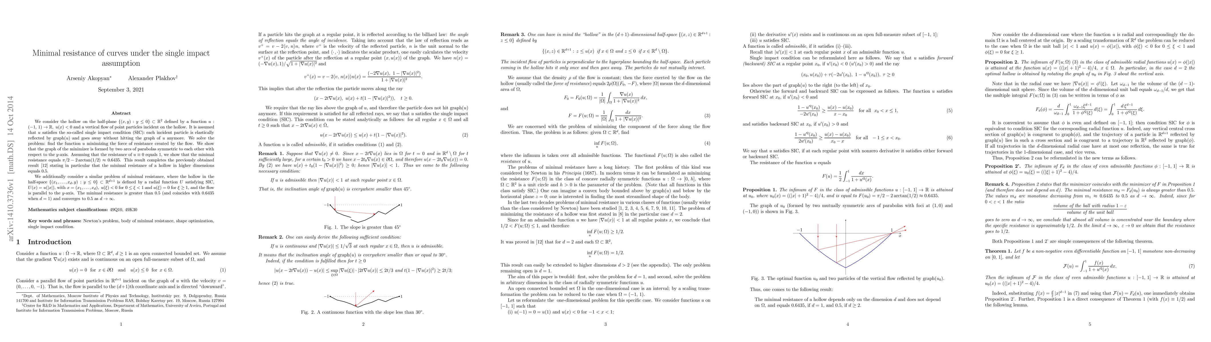 We consider the hollow on the half-plane $\{(x,y) : y \le 0\} \subset \mathbb{R}^2$ defined by a function $u : (-1, 1) \to \mathbb{R}$, $u(x) < 0$ and a vertical flow of point particles incident on the hollow. It is assumed that $u$ satisfies the so-called single impact condition (SIC): each incident particle is elastically reflected by graph$(u)$ and goes away without hitting the graph of $u$ anymore. We solve the problem: find the function $u$ minimizing the force of resistance created by the flow. We show that the graph of the minimizer is formed by two arcs of parabolas symmetric to each other with respect to the $y$-axis. Assuming that the resistance of $u \equiv 0$ equals 1, we show that the minimal resistance equals $\pi/2 - 2\arctan(1/2) \approx 0.6435$. This result completes the previously obtained result stating in particular that the minimal resistance of a hollow in higher dimensions equals 0.5. We additionally consider a similar problem of minimal resistance, where the hollow in the half-space $\{(x_1,\ldots,x_d, y) : y \le 0 \} \subset \mathbb{R}^{d+1}$ is defined by a radial function $U$ satisfying SIC, $U(x) = u(|x|)$, with $x = (x_1,\ldots,x_d), u(\xi) < 0$ for $0 \le \xi < 1$ and $u(\xi) = 0$ for $\xi \ge 1$, and the flow is parallel to the $y$-axis. The minimal resistance is greater than $0.5$ (and coincides with $0.6435$ when $d = 1$) and converges to $0.5$ as $d \to \infty$.