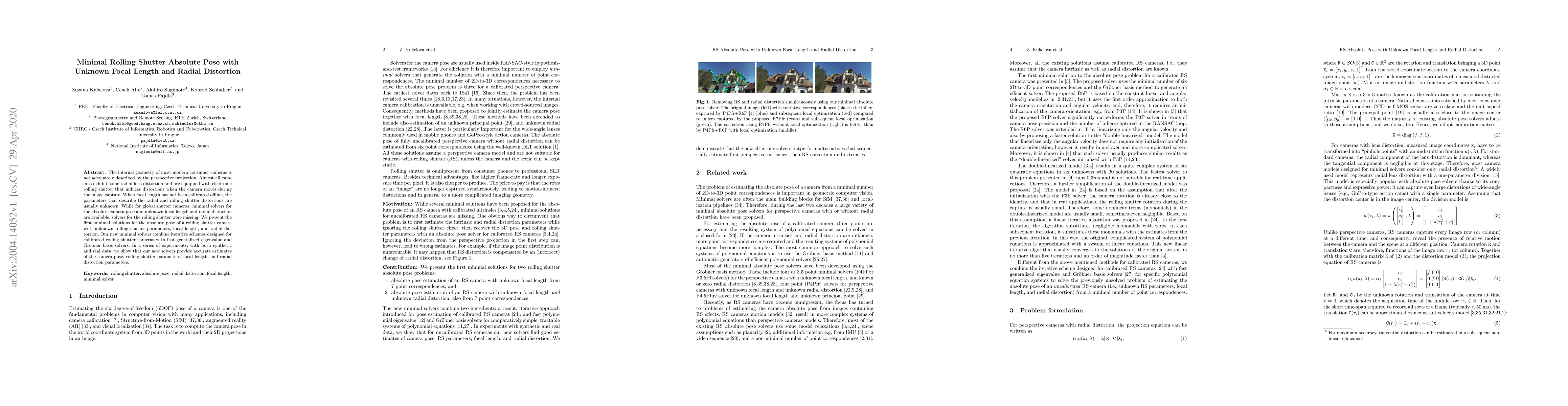 The internal geometry of most modern consumer cameras is not adequately described by the perspective projection. Almost all cameras exhibit some radial lens distortion and are equipped with an electronic rolling shutter that induces distortions when the camera moves during the image capture. When focal length has not been calibrated offline, the parameters that describe the radial and rolling shutter distortions are usually unknown. While for global shutter cameras, minimal solvers for the absolute camera pose and unknown focal length and radial distortion are available, solvers for the rolling shutter were missing. We present the first minimal solutions for the absolute pose of a rolling shutter camera with unknown rolling shutter parameters, focal length, and radial distortion. Our new minimal solvers combine iterative schemes designed for calibrated rolling shutter cameras with fast generalized eigenvalue and Groebner basis solvers. In a series of experiments, with both synthetic and real data, we show that our new solvers provide accurate estimates of the camera pose, rolling shutter parameters, focal length, and radial distortion parameters.