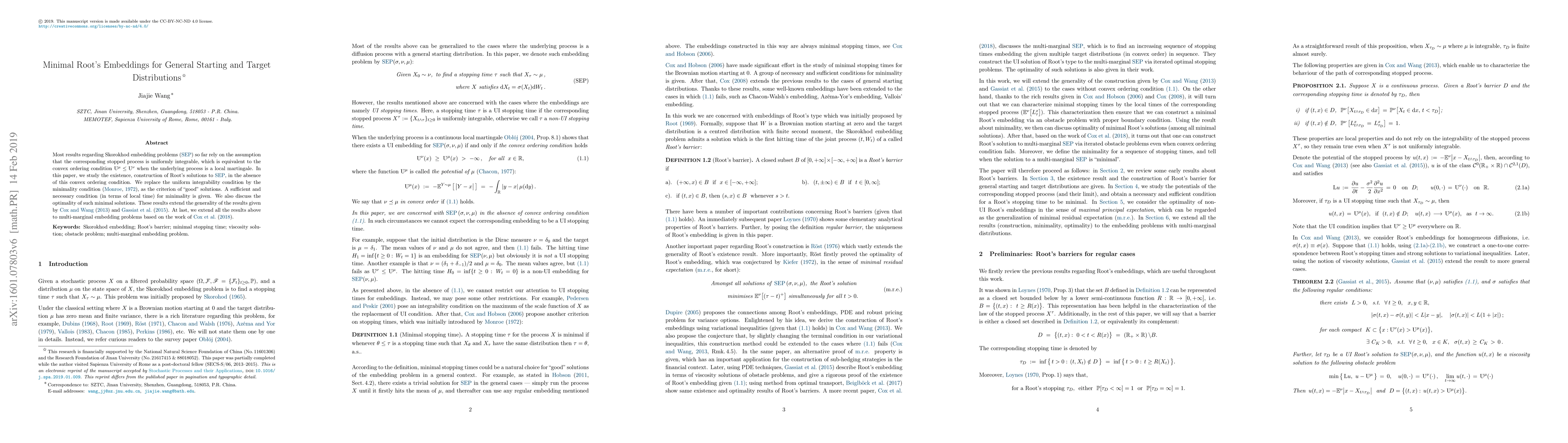 Most results regarding Skorokhod embedding problems (SEP) so far rely on the assumption that the corresponding stopped process is uniformly integrable, which is equivalent to the convex ordering condition $\mathrm{U}^{\mu}\leq\mathrm{U}^{\nu}$ when the underlying process is a local martingale. In this paper, we study the existence, construction of Root's solutions to SEP, in the absence of this convex ordering condition. We replace the uniform integrability condition by the minimality condition (Monroe,1972), as the criterion of "good" solutions. A sufficient and necessary condition (in terms of local time) for minimality is given. We also discuss the optimality of such minimal solutions. These results extend the generality of the results given by Cox and Wang [2013] and Gassiat et al. [2015]. At last, we extend all the results mentioned above to multi-marginal embedding problems based on the work of Cox et al. [2018].