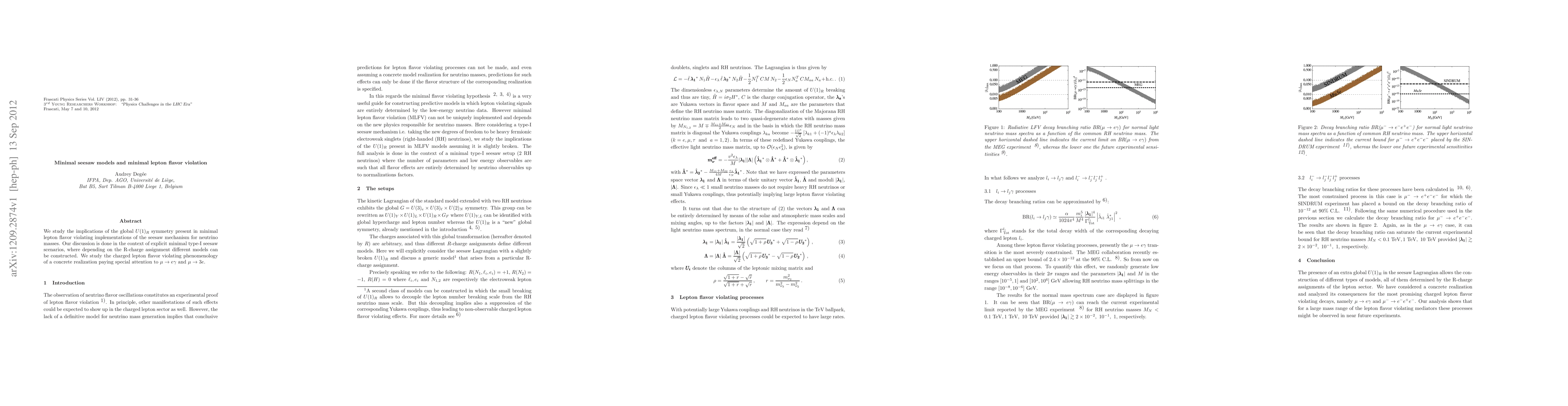 We study the implications of the global $U(1)_R$ symmetry present in minimal lepton flavor violating implementations of the seesaw mechanism for neutrino masses. Our discussion is done in the context of explicit minimal type-I seesaw scenarios, where depending on the R-charge assignment different models can be constructed. We study the charged lepton flavor violating phenomenology of a concrete realization paying special attention to $\mu\to e\gamma$ and $\mu\to 3e$.