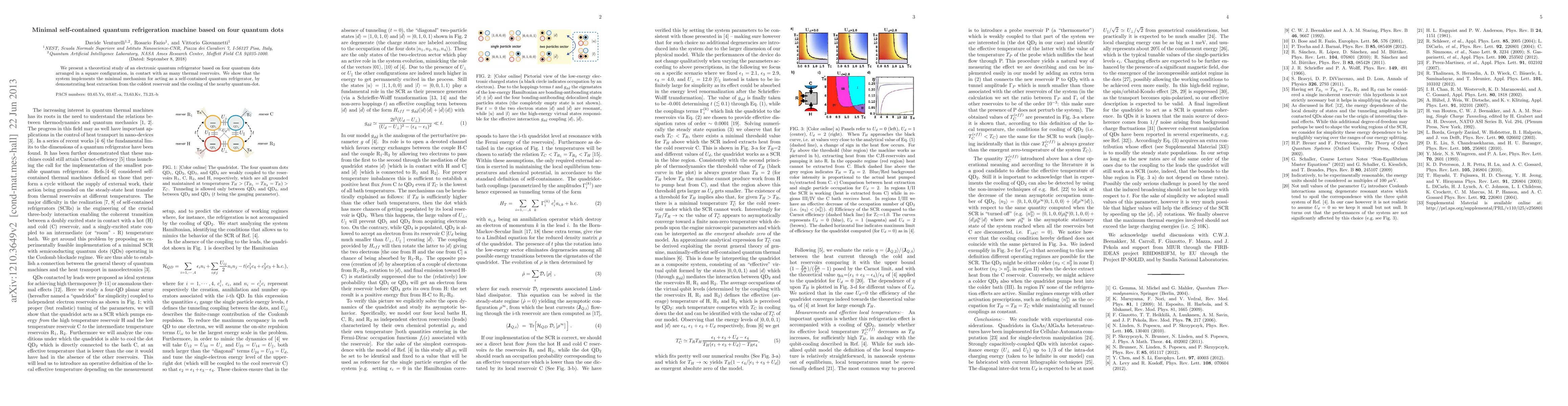 We present a theoretical study of an electronic quantum refrigerator based on four quantum dots arranged in a square configuration, in contact with as many thermal reservoirs. We show that the system implements the basic minimal mechanism for acting as a self-contained quantum refrigerator, by demonstrating heat extraction from the coldest reservoir and the cooling of the nearby quantum-dot.