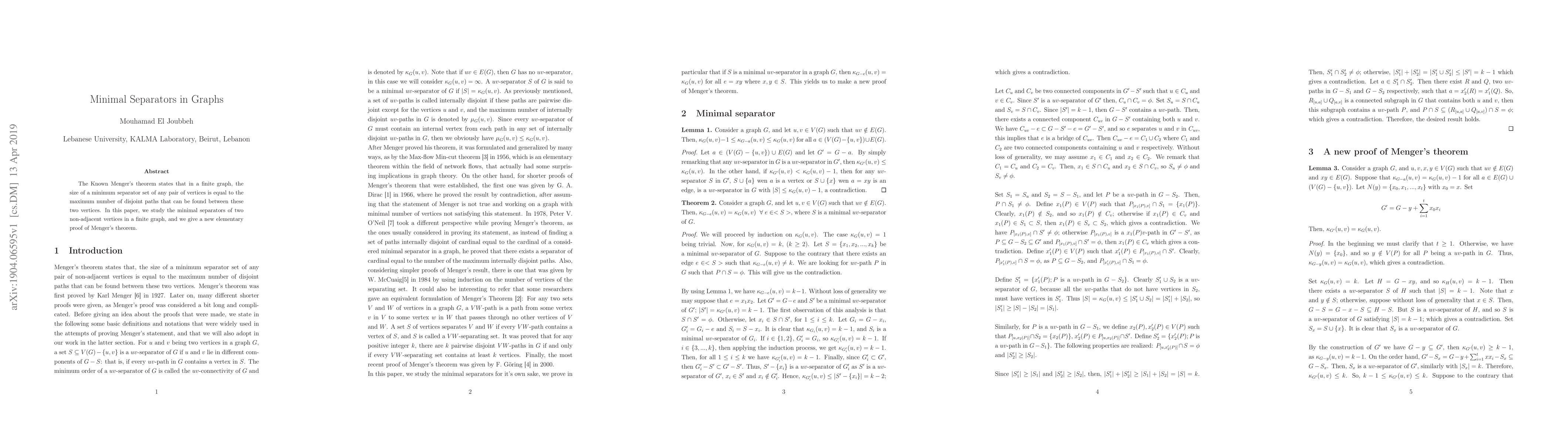 This paper investigates the minimal separators between two non-adjacent vertices in finite graphs and presents a new, elementary proof of Menger's theorem, which relates the size of the smallest separator to the maximum number of disjoint paths between the vertices.