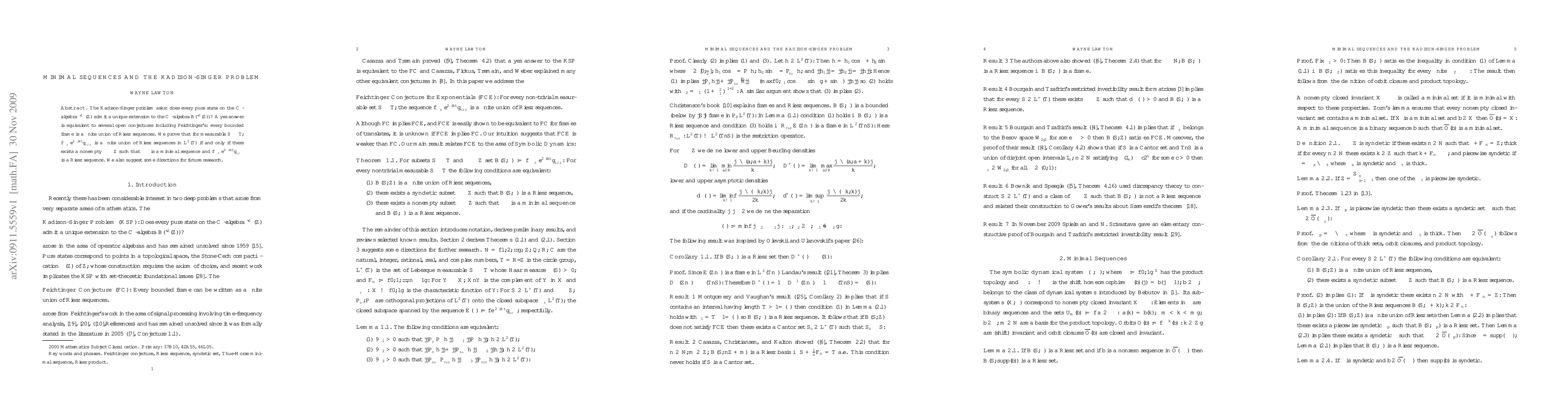The Kadison-Singer problem investigates whether every pure state on the diagonal subalgebra of a C*-algebra admits a unique extension. The paper proves that Feichtinger's conjecture for exponentials holds if and only if there exists a Riesz subsequence corresponding to integers whose characteristic function is a nonzero minimal sequence.