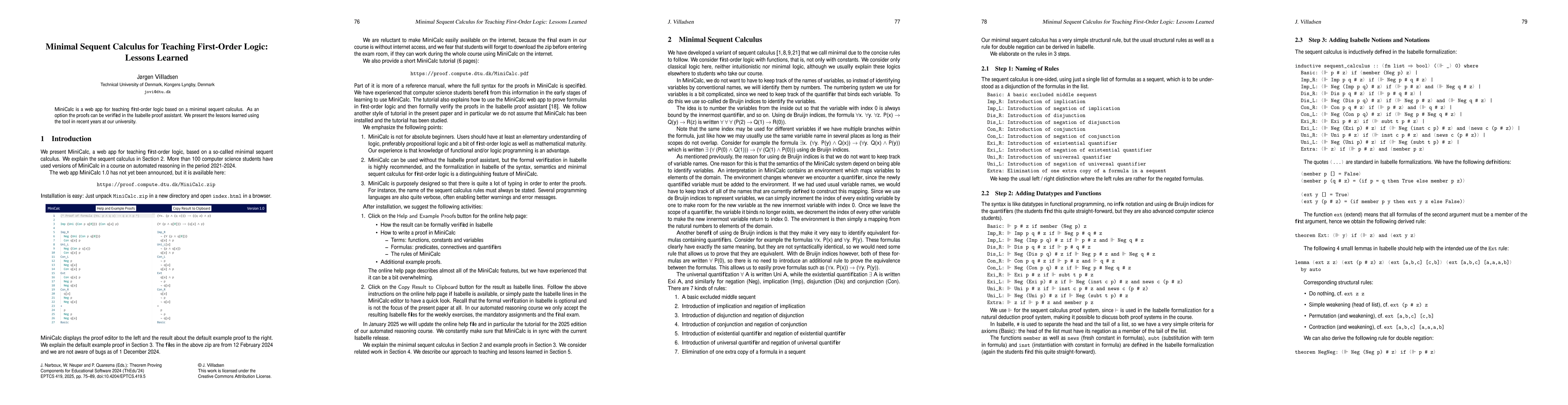 The paper discusses the implementation and application of MiniCalc, a web application for teaching first-order logic based on a minimal sequent calculus, with optional verification in the Isabelle proof assistant.