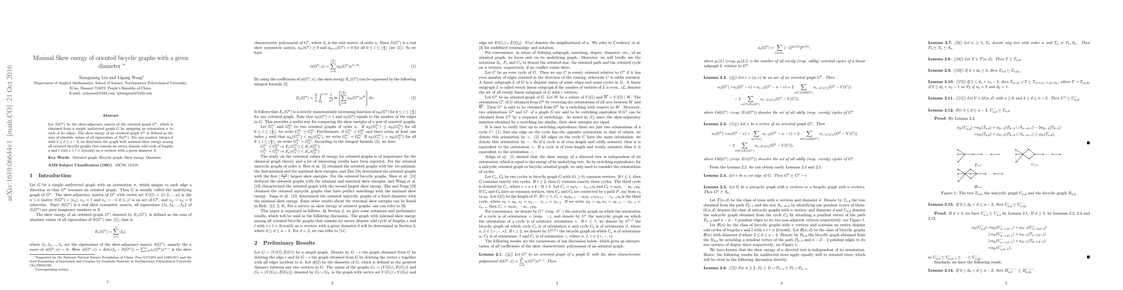 This paper investigates the minimal skew energy in oriented bicyclic graphs with a diameter $d$ and no vertex disjoint odd cycles of specific lengths. It determines the graph configuration that minimizes this energy for $3 \leq d \leq n-3$ on $n$ vertices.