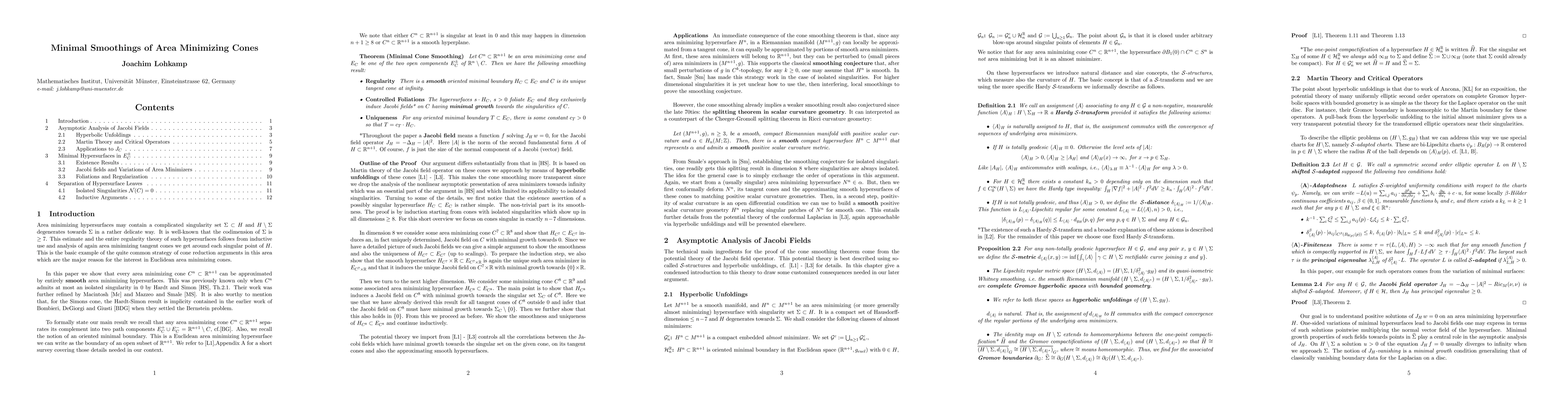 In this paper we show that every area minimizing cone C^{n-1} in R^n can be approximated by entirely smooth area minimizing hypersurfaces. This extensively uses hyperbolic unfoldings of such hypersurfaces and the resulting potential theory for the Jacobi field operator. Applications include the splitting theorem in scalar curvature geometry saying that any (n-1)-dim. homology class of a compact manifold M^n with positive scalar curvature can be represented by a smooth (!) compact hypersurface that admits a positive scalar curvature metric.