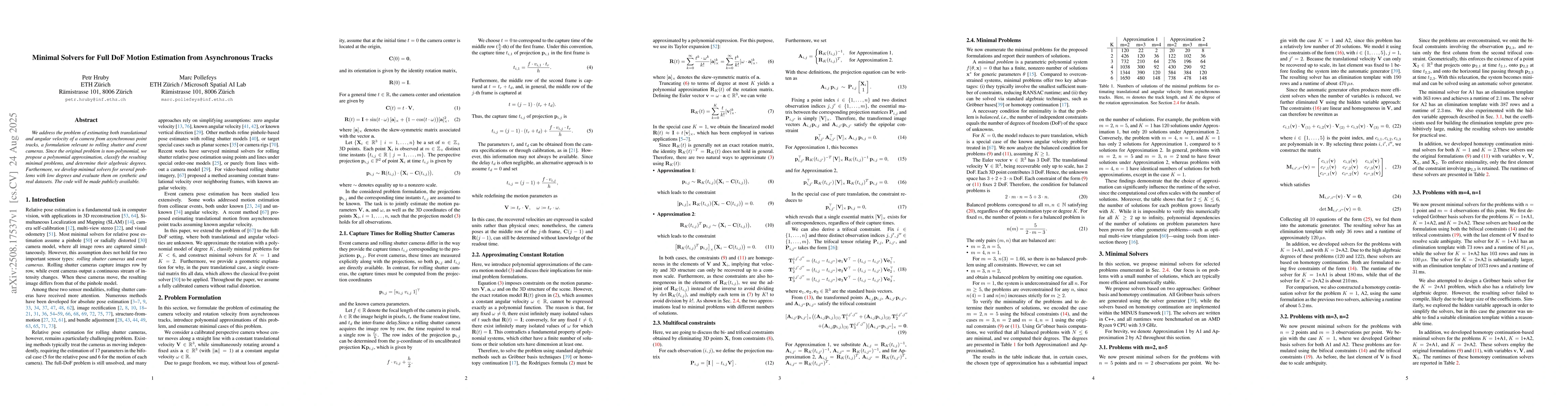 We address the problem of estimating both translational and angular velocity of a camera from asynchronous point tracks, a formulation relevant to rolling shutter and event cameras. Since the original problem is non-polynomial, we propose a polynomial approximation, classify the resulting minimal problems, and determine their algebraic degrees. Furthermore, we develop minimal solvers for several problems with low degrees and evaluate them on synthetic and real datasets. The code will be made publicly available.